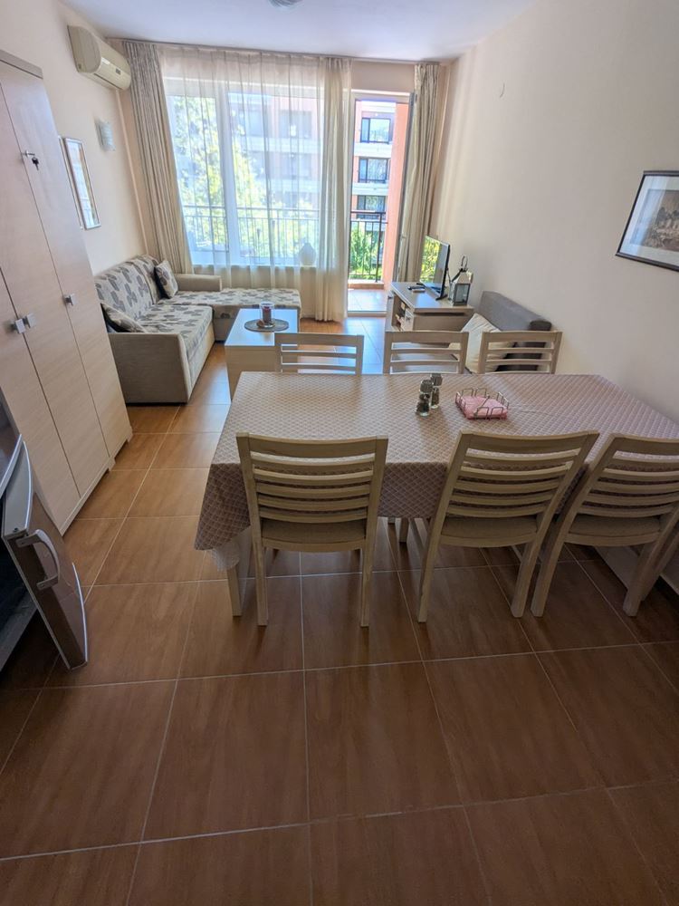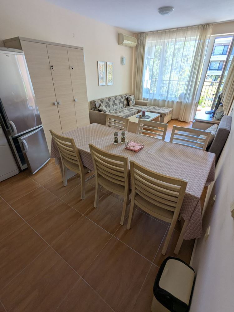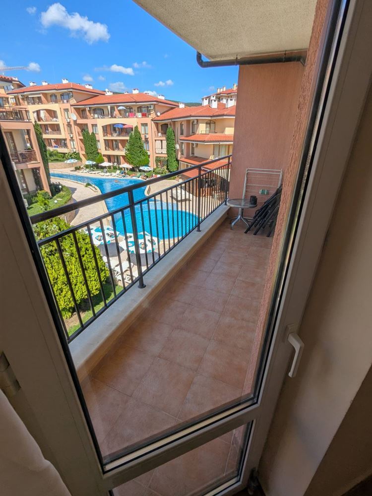 Напълно обзаведения тристаен апартамент с гледка басейн в комплекс в Свети Влас се намира в красивия и спокоен район на 200 метра от морския бряг. Комплексът се различава с разчупена архитектура, с отлична инфраструктура, добри комуникации и разположени наблизо автобусни спирки и е идеален за постоянно живеене.