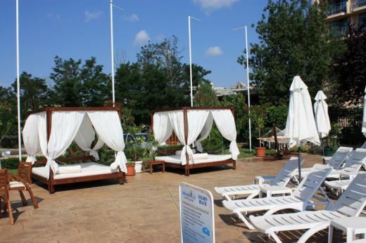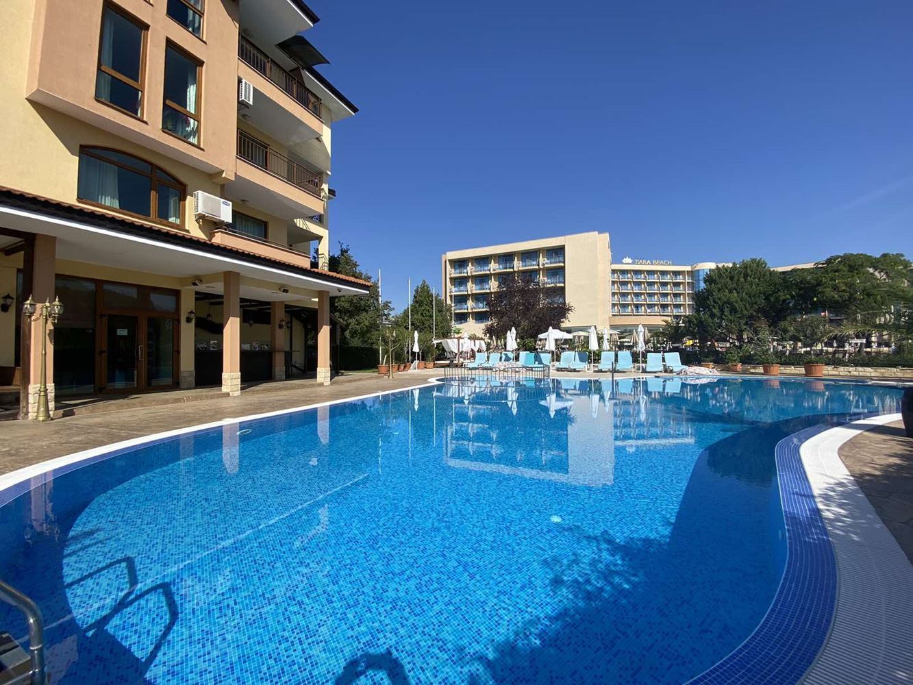 Комплексът е истински оазис за почивка и удобство. На разположение на собствениците и техните гости са голям басейн с шезлонги, където можете да се насладите на слънчевите дни, лоби бар и рецепция за комфорт и сигурност, разнообразни магазини за ежедневни нужди, както и паркинг. Добре поддържаните алеи за разходки в двора допълват усещането за спокойствие и зеленина. Локацията е безспорно едно от най-големите предимства на имота – само на крачка от плажа и в сърцето на оживения курорт. На пешеходно разстояние ще откриете всичко необходимо за пълноценен престой: магазини, ресторанти, барове, казина, нощни клубове, сувенирни павилиони, медицински център, обществен транспорт, сладкарници, кафенета, пазари, банки, обмяна на валута, поща и салони за красота.