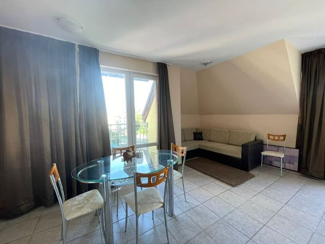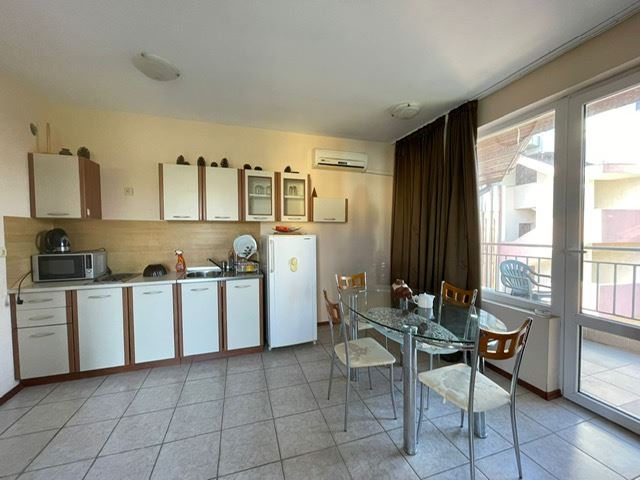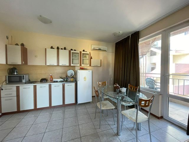 Двустаен апартамент в комплекс на Слънчев бряг предлага уютно и функционално пространство, включващо дневна с кухня и трапезария, една спалня, баня с тоалетна и две тераси. Това комфортно жилище с площ 59 кв. м. е напълно оборудвано с всичко необходимо за удобен живот, включително кухненски бокс с уреди, мебели за дневната и спалнята, както и климатик за комфортен климат. Наличието на две тераси ви позволява да се наслаждавате на свежия въздух и гледката към комплекса и парка, което създава уютна атмосфера за отдих. Разположен на Слънчев бряг, комплексът предлага редица удобства, включително зелени площи, паркинг, плувен басейн и места за релакс. Този апартамент би могъл да бъде чудесен вариант за инвестиция, тъй като имотите в Слънчев бряг са популярни сред туристите и постоянно пребиваващите.