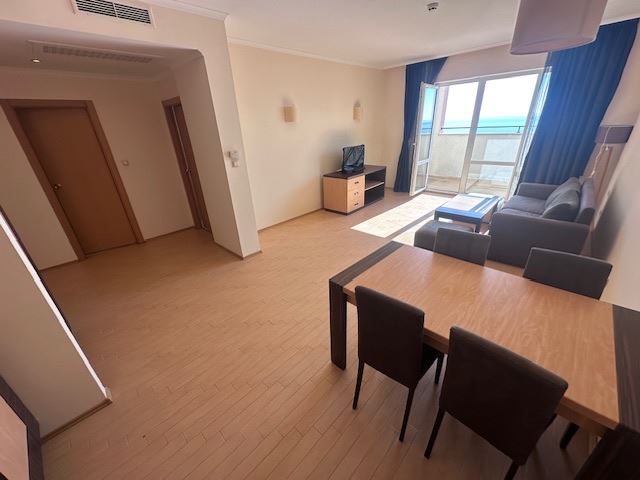 Представяме ви един уникален панорамен двустаен апартамент с директна гледка към безкрайното море, който се намира в известния курортен комплекс к.к. Слънчев бряг, Бургас. Този имот предлага на своите жители лукс, комфорт и невероятно изживяване на морския бряг. С площ от 93 м2, апартаментът е просторен и уютно обзаведен, предоставяйки всичко необходимо за един комфортен живот или незабравими ваканции. Състои се от две стаи, включително една спалня, една баня и един балкон, откъдето можете да се насладите на панорамната морска гледка и да се отпуснете с чаша кафе или любимата си напитка.