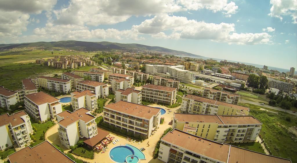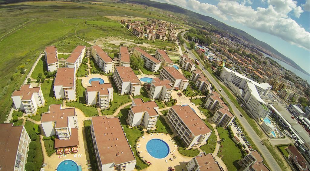 Локацията на комплекса е изключително удобна – в непосредствена близост до Action Aquapark и на пешеходно разстояние от плажа и центъра на Слънчев бряг. Това позволява лесен достъп до всички развлечения, ресторанти, магазини и атракции, като същевременно запазва спокойната атмосфера на комплекса.