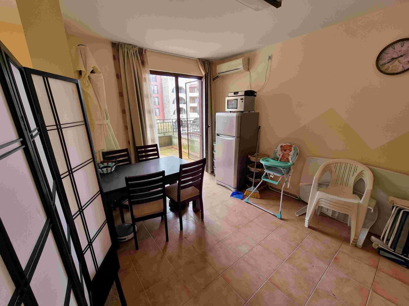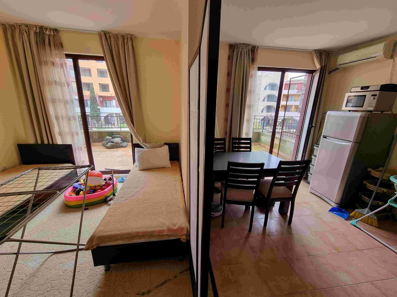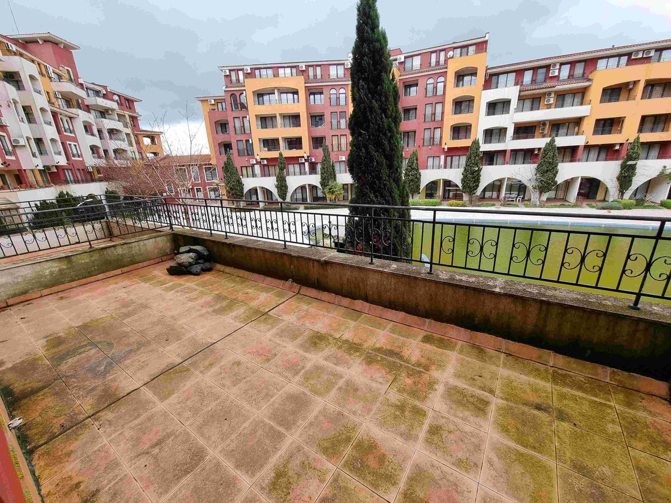 Просторен апартамент с една спалня на брега на морето в малък морски курортен град Ахелой. Комплексът е завършен и пуснат в експлоатация. На площ от 40000 м2 са обособени зони, които придават индивидуалност на целия комплекс. За удобство на гостите и собствениците на апартаменти комплексът предлага следните услуги и удобства - четири ресторанта и няколко кафенета; два плувни басейна с барове и денонощно работещ спасител; СПА център, фитнес център; магазин за хранителни стоки; няколко специализирани магазина; безжичен интернет в целия комплекс. Предлаганият апартамент се намира на втория етаж. Той е с чиста жилищна площ от 58 м2 и има следното разпределение: коридор/входно антре, дневна с кухня, спалня, баня с тоалетна и балкон с гледка към басейна. Продава се напълно обзаведен.