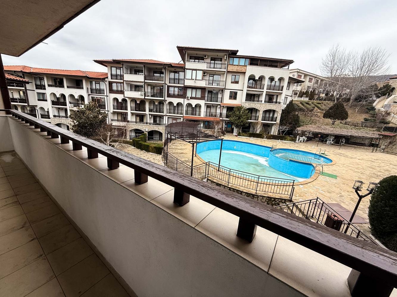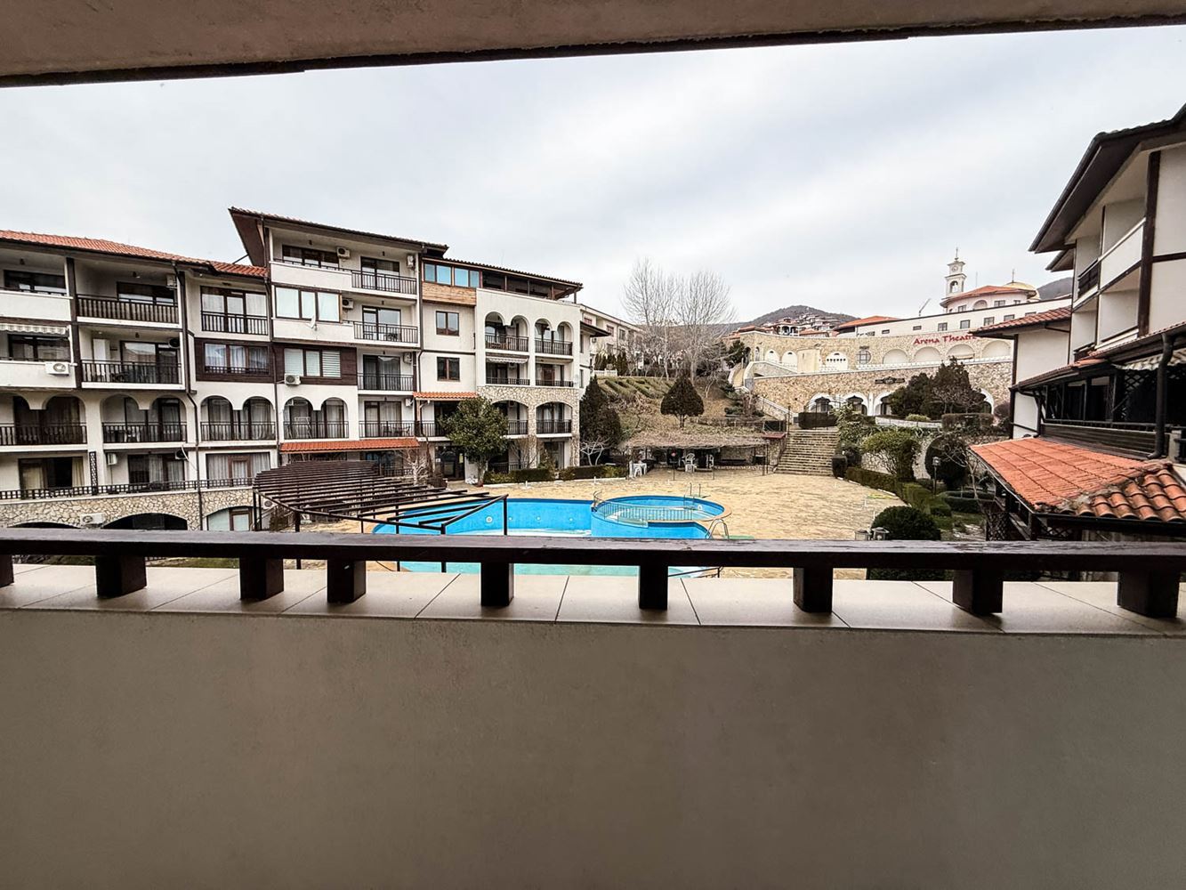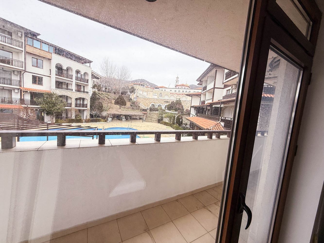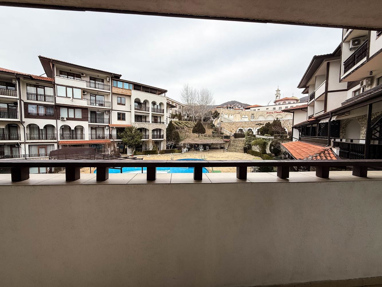 Апартаментът се състои от уютен хол с кухненска част, спалня, баня с тоалетна и тераса, от която се разкрива приятна гледка към басейна и зелените площи на комплекса. Пространството е организирано практично, а естествената светлина допринася за усещането за простор и спокойствие. Имотът се продава напълно обзаведен, което позволява незабавно ползване без необходимост от допълнителни разходи.