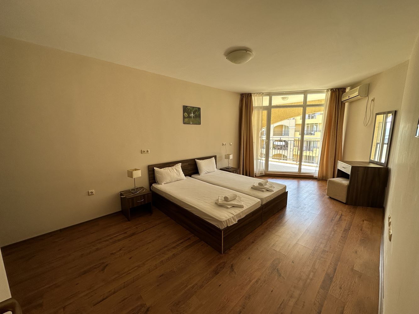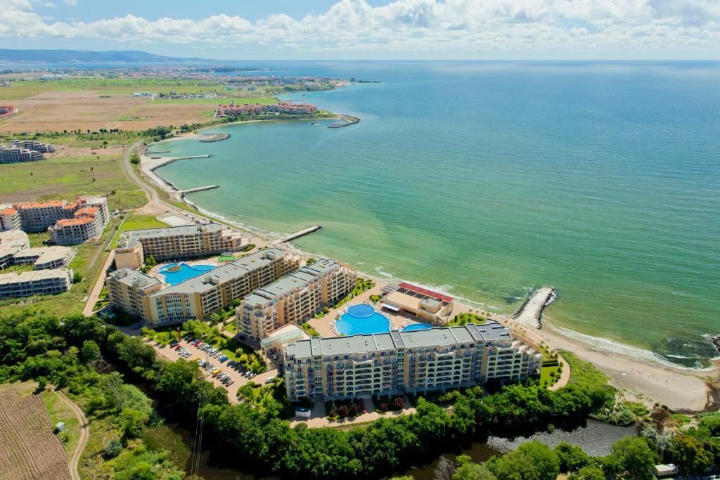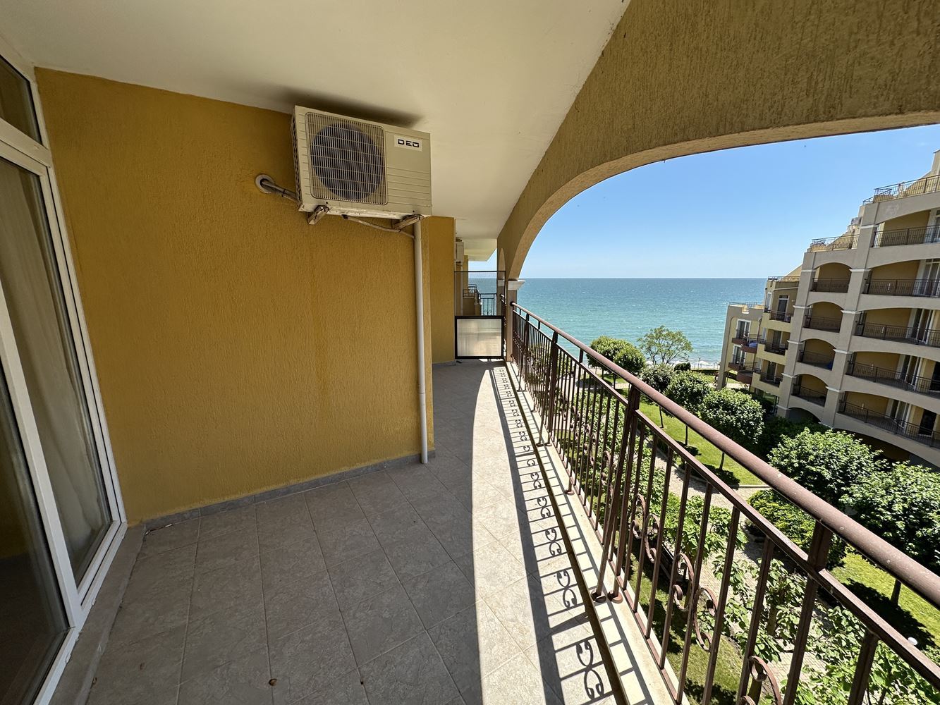 Двустаен апартамент на първа линия с гледка море в комплекс в Ахелой. Жилището е с площ от 73 кв. м. на четвърти етаж. Жилището се състои от антре, просторен хол с обособена кухня, голяма спалня, баня с WC и балкон. Удобства: два големи плувни басейна, ресторант, бар към басейна, магазин, фризьорски салон, паркинг, фитнес, коли под наем и портиер. Комплексът се отличава с отлично поддържани зелени площи, спокойна атмосфера, съвременен дизайн, открити пространства. Състои се от две сгради с партерен етаж и шест жилищни етажа, с югоизточно изложение. Предлага богат избор на екстри.