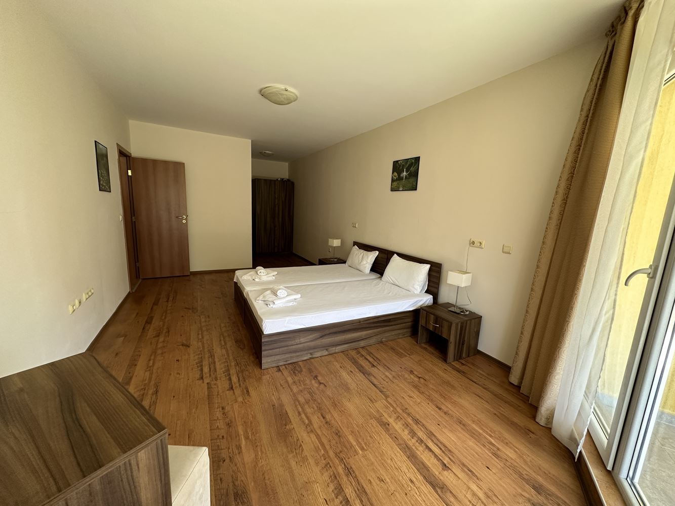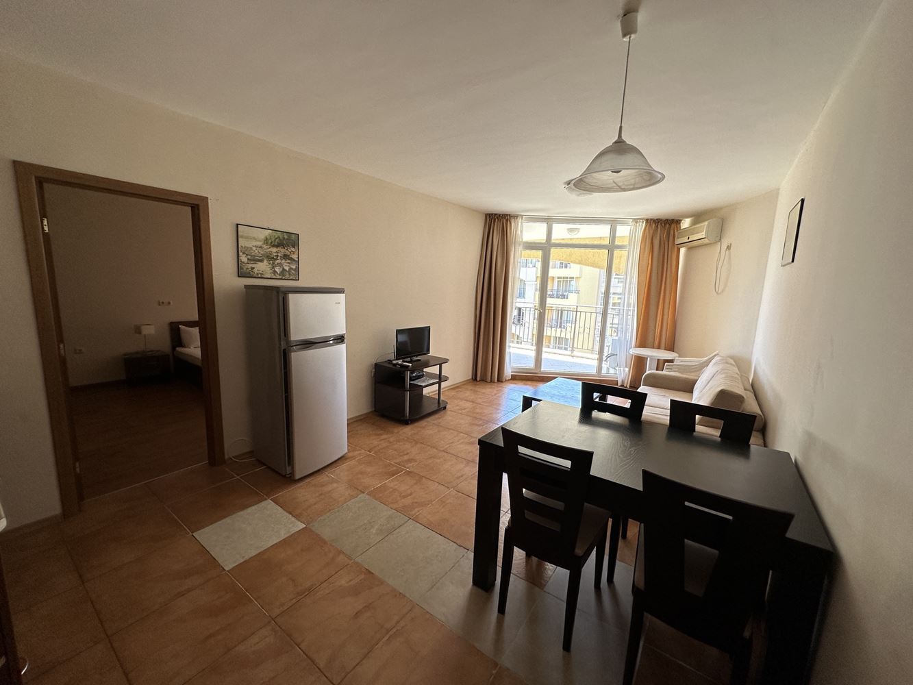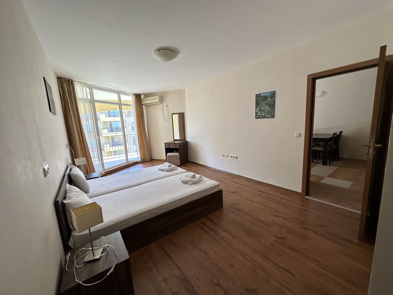 Двустаен апартамент на първа линия с гледка море в комплекс в Ахелой. Жилището е с площ от 73 кв. м. на четвърти етаж. Жилището се състои от антре, просторен хол с обособена кухня, голяма спалня, баня с WC и балкон. Удобства: два големи плувни басейна, ресторант, бар към басейна, магазин, фризьорски салон, паркинг, фитнес, коли под наем и портиер. Комплексът се отличава с отлично поддържани зелени площи, спокойна атмосфера, съвременен дизайн, открити пространства. Състои се от две сгради с партерен етаж и шест жилищни етажа, с югоизточно изложение. Предлага богат избор на екстри.