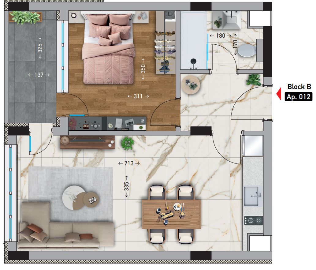 Апартаментът е проектиран с добре обмислено разпределение, което осигурява удобство и практичност в ежедневието. Пространствата са светли и уютни, подходящи за целогодишно обитаване или ваканционен престой. Партерното разположение добавя допълнително удобство и лесен достъп до общите части и зоните за отдих в комплекса. Издава се в степен на завършеност „до ключ“, предвидена и възможност за пакетно обзавеждане срещу допълнително заплащане.