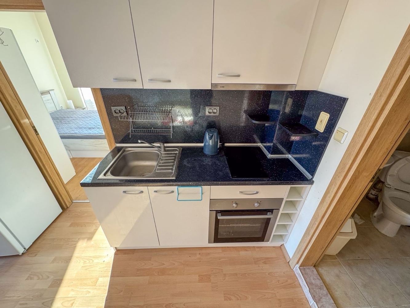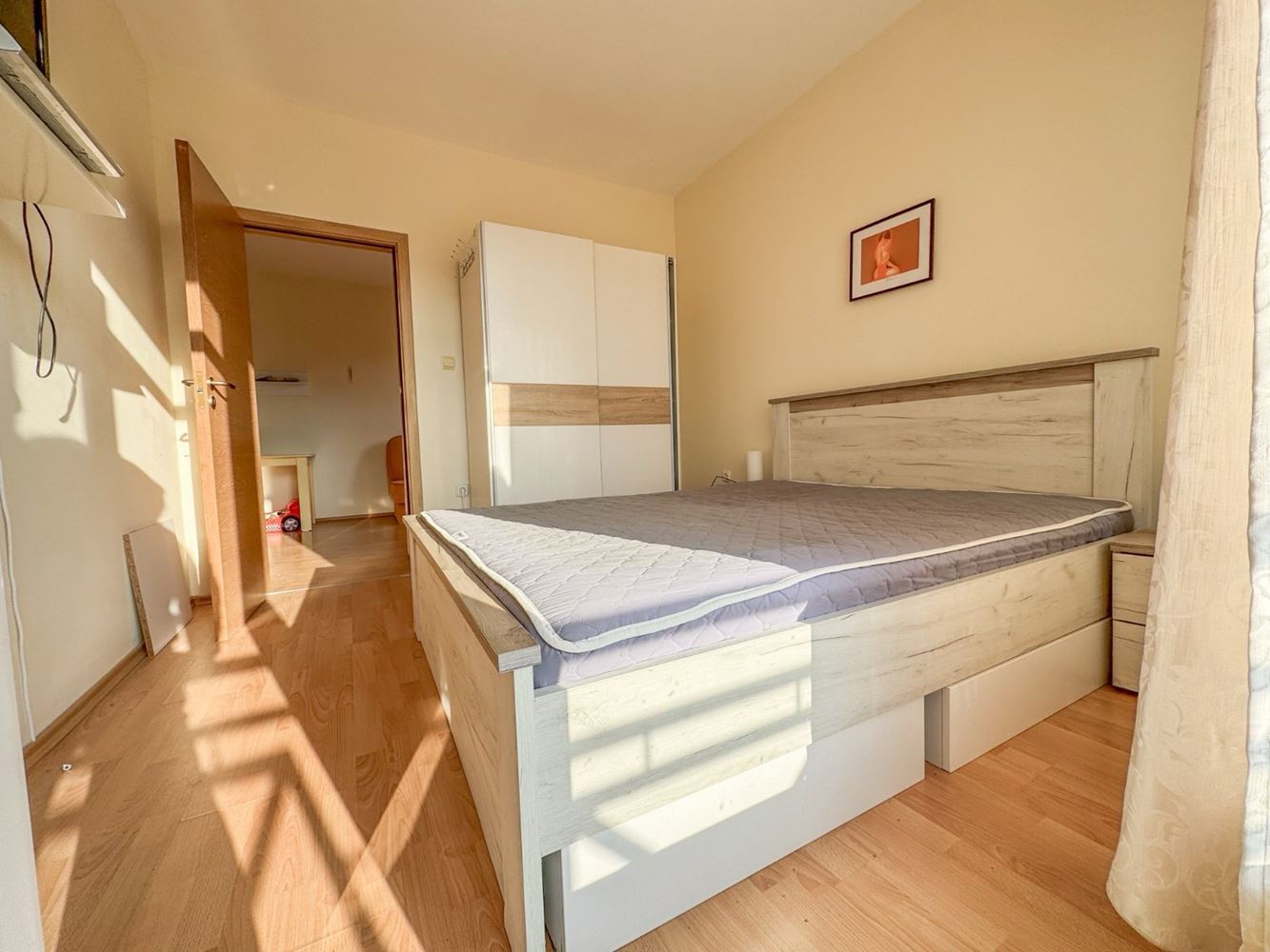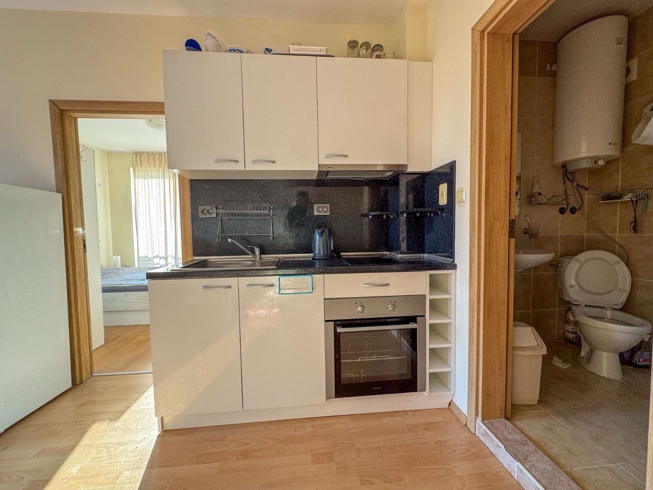 Жилището се състои от светла дневна с кухненски бокс, една спалня, баня с тоалетна и комфортен балкон, от който се разкрива прекрасна гледка към басейна и спортната площадка на комплекса. Апартаментът разполага с отделна партида за ток и е с издаден Акт 16, което гарантира сигурност и спокойствие при покупката.