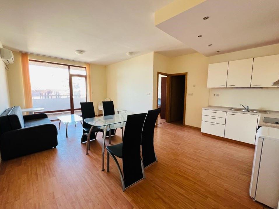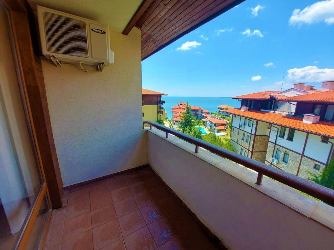 Двустаен апартамент на първа линия с гледка море в луксозен комплекс в Свети Влас. Апартаментът е с площ от 75 кв. м. на четвърти етаж. Състои се от входно антре, трапезария с кухненски бокс, спалня, баня с WC и тераса с гледка към морето и градината на територия на комплекса. Продава се напълно обзаведен. Комплексът разполага със седем плувни басейна и един закрит басейн, три ресторанта, аква-барове, два тенис корта, фитнес зала, интернет зала, козметичен салон със сауна и солариум, фризьорски салон, супермаркет, обменно бюро, паркинг.