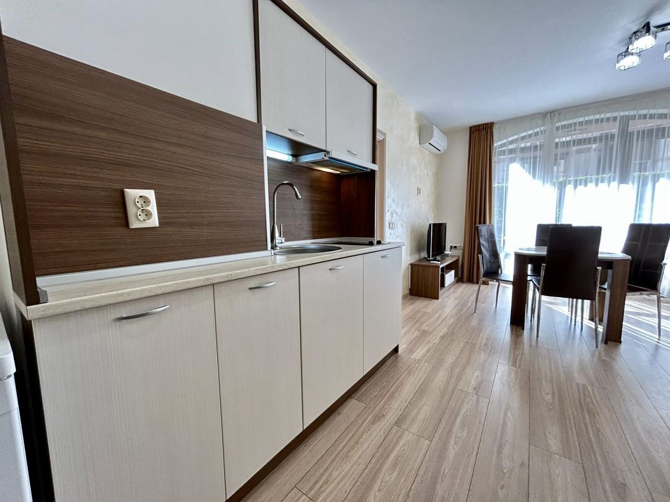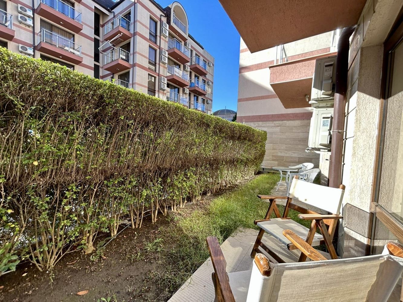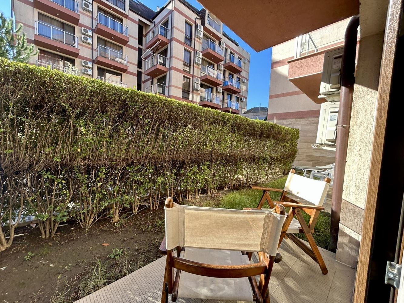 Двустаен апартамент с просторна тераса и директен достъп до басейна в Слънчев бряг