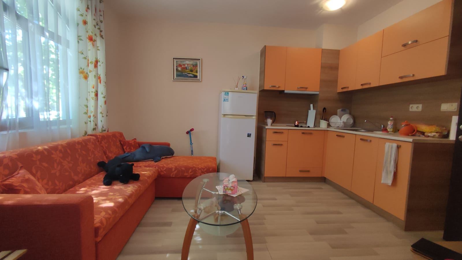 Двустаен апартамент в охраняем комплекс Аполон-Несебър на 300 м от морето. Апартаментът с площ 55 кв.м. на партер и се състои от антре, хол с кухня, спалня, баня с тоалетна и тераса с директен излаз към басейна. Продава се напълно обзаведен. Удобства: басейн, детски басейн, детска площадка, паркинг, охрана.