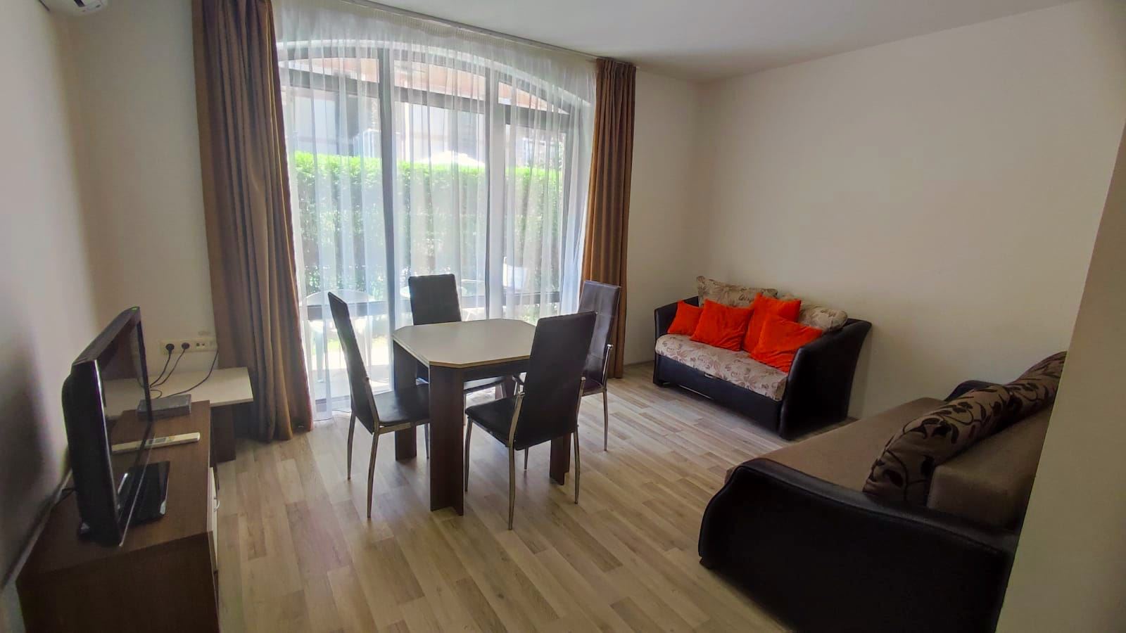 Апартамент с една спалня в комплекс Тарсис. Жилището е с площ 75 кв.м + 20 кв.м вътрешен двор, който не е включен в общата площ на апартамента. Състои се от всекидневна с кухненски бокс, спалня, баня с тоалетна и тераса. Продава се напълно обзаведен. Комплекс Тарсис се намира в най-зелената и спокойна част на Слънчев бряг със собствения си прекрасен парк и на 500 метра от най хубавия плаж. Комплексът се състои от пет жилищни корпуса, разполага с градини и зони за отдих, СПА център, открит и закрит детски кът с анимация, два басейна, ресторант, барбекю градина, тепаняки бар, два коктейл бара, караоке, пиано бар, салон за красота, подземен и надземен паркинг, охрана.