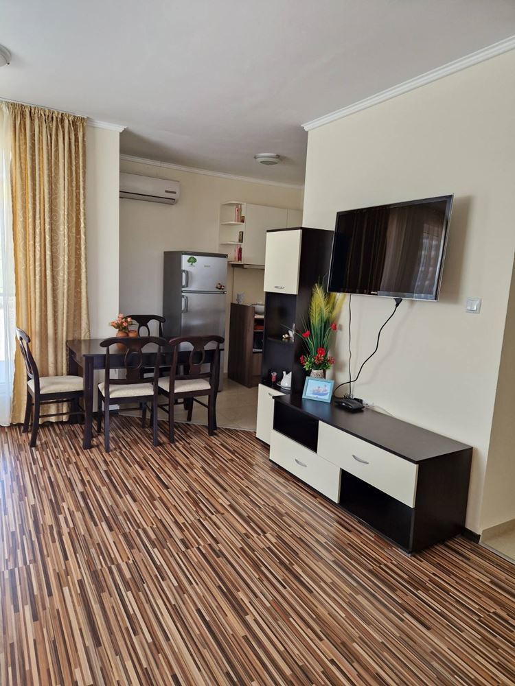 Двустаен апартамент в комплекс в Свети Влас. Апартаментът е с площ от 60 кв. м. на втори етаж. Състои се от антре, хол с кухня и кът за почивка, спалня, баня с тоалетна и тераса. Продава се напълно обзаведен. Комплексът работи целогодишно, има добре поддържана територия, басейн, паркинг, 24-часова охрана и обслужване.
