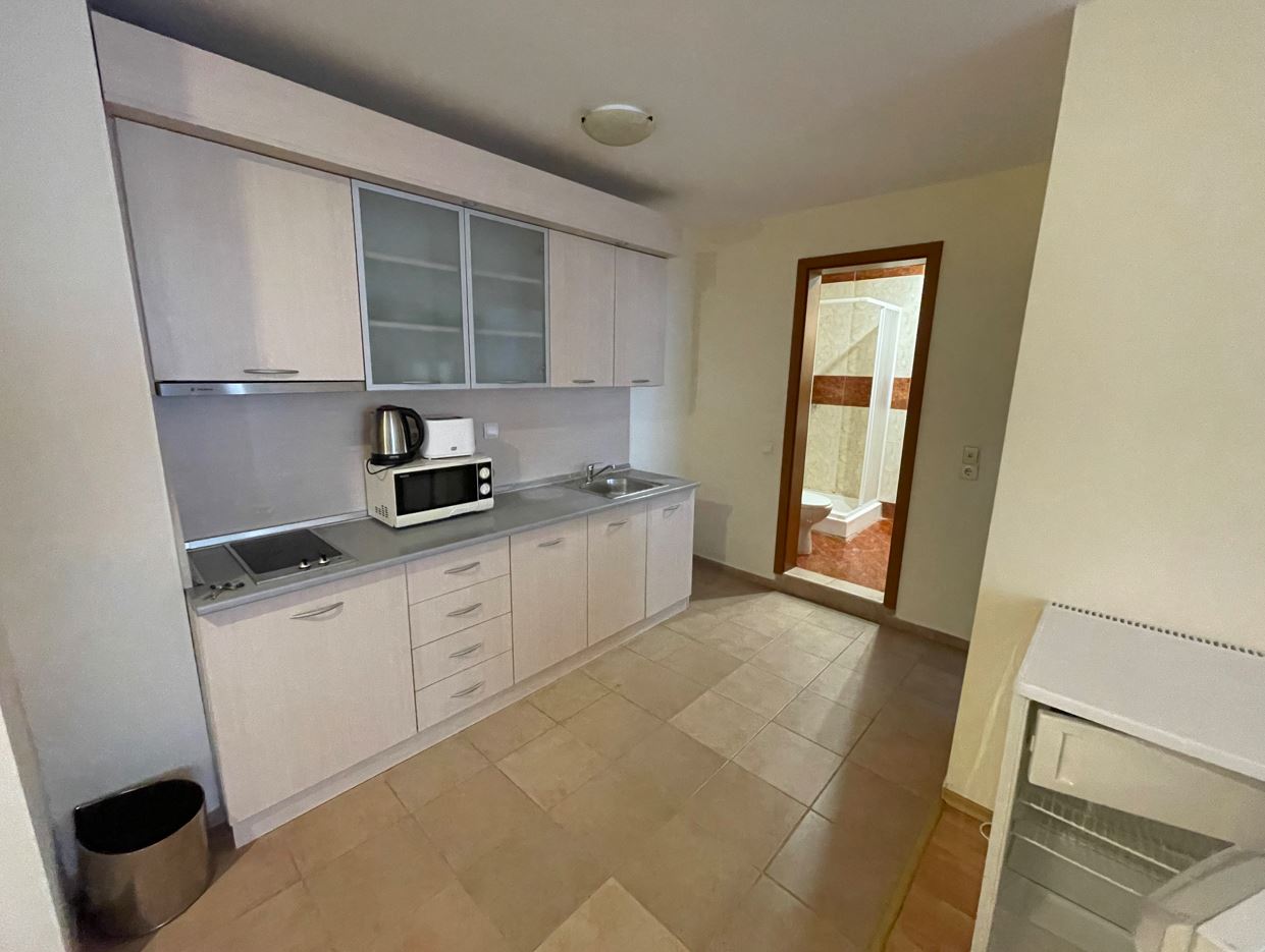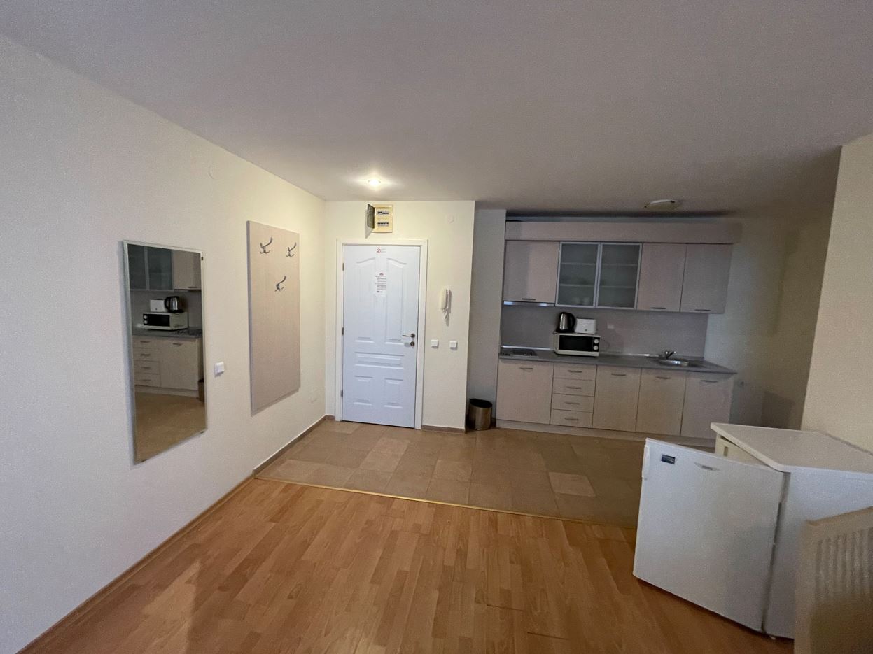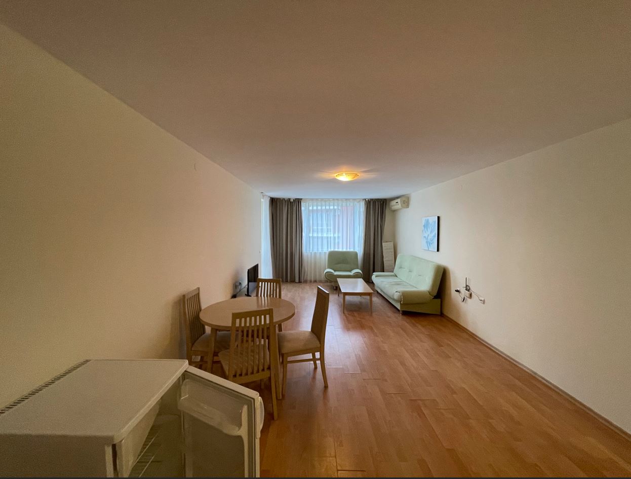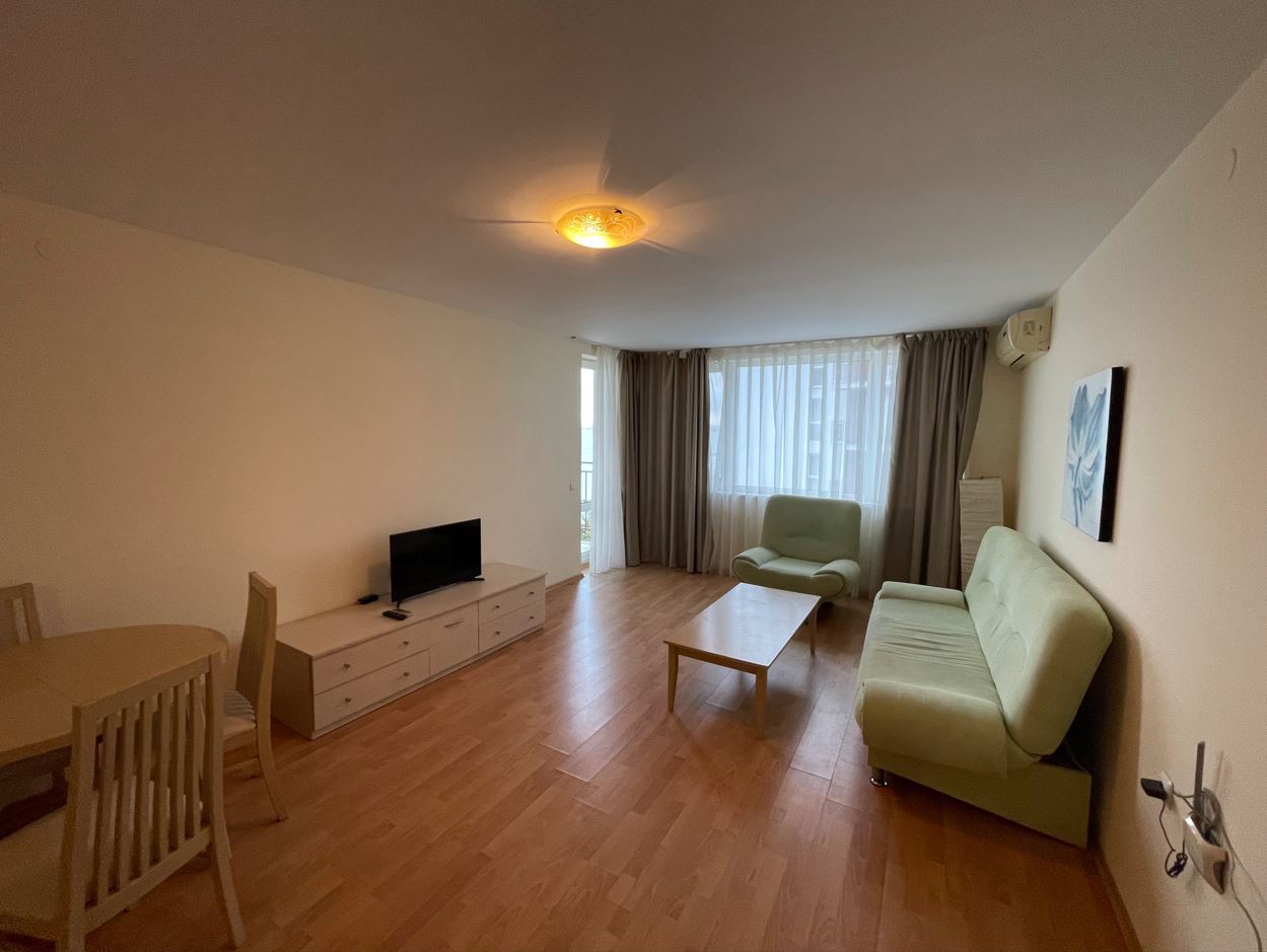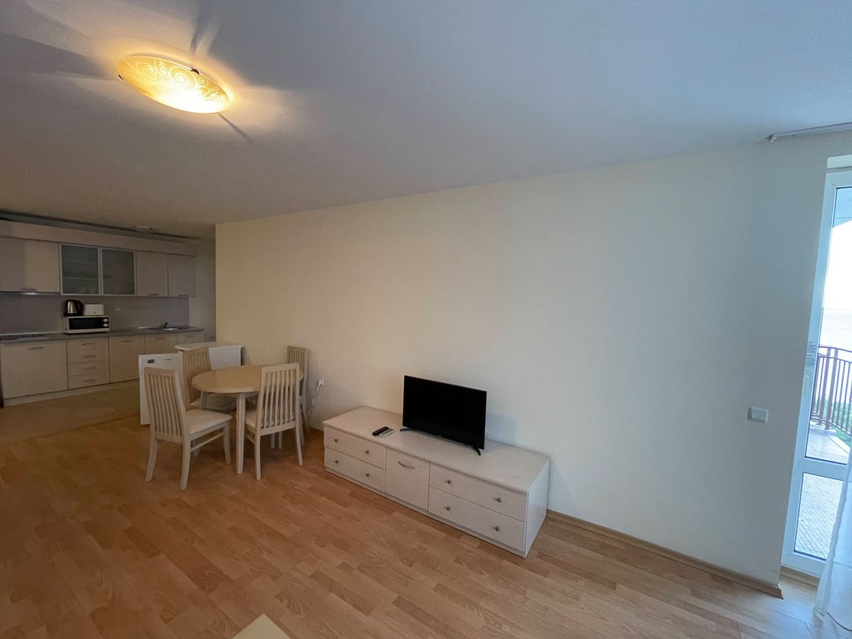 Апартаментът се продава напълно обзаведен – готов е за ползване веднага. Интериорът е решен в приятни, светли тонове, създаващи усещане за уют и простор. Дневната зона предлага място за почивка и хранене, а кухненският кът е оборудван с всичко необходимо за ежедневния комфорт. Спалнята е тиха и комфортна, с достатъчно пространство за съхранение. Банята е модерно изпълнена, с качествени настилки и санитария. Терасата е истинското бижу на този имот – достатъчно просторна, за да се насладите на утринното кафе с гледка към морето или на вечерен релакс под открито небе. Етажът и изложението осигуряват приятна осветеност и въздух през целия ден.