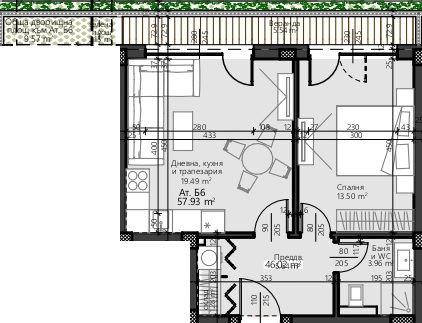 Представяме ви комфортен двустаен апартамент с лично дворче, разположен в нова жилищна сграда в една от най-тихите и предпочитани части на кв. Сарафово, Бургас. Локацията съчетава спокойствие и отлична комуникативност — само на няколко минути пеша от златистата плажна ивица, с удобен достъп до летището и центъра на града. Имотът е с обща площ 67.61 м2, ситуиран на партер и с изложение север — практичен избор, който осигурява приятна прохлада през летните месеци. Разпределението е функционално и удобно: просторна дневна с кухненски бокс и излаз към лично дворче, уютна спалня, баня с тоалетна, входно антре и тераса. Частното дворче добавя усещане за собствен дом — перфектно за сутрешно кафе, зелена зона, място за игра на деца или кът за домашни любимци.