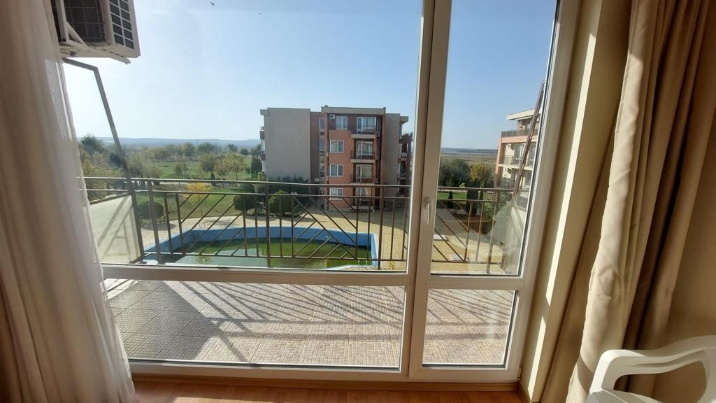 Едностаен апартамент в комплекс Холидей Форт Клуб на Слънчев бряг. Апартаментът се намира на трети етаж. Състои се от входно антре, хол с кухненски бокс, баня с тоалетна и тераса. С гледка басейн. Продава се напълно обзаведен. Намира се до аквапарка и на около 10 мин пеша до плажа. Има богато озеленена територия с няколко външни басейна, зона за тренировки на открито, детски площадки. Удобства в комплекса: два ресторанта; бар; 5 плувни басейна за възрастни със спасители; басейн за деца със спасител; супермаркет; магазини за сувенири и плажни аксесоари; фитнес и сауна; бюро за обмяна на валута; детска площадка с люлки и пързалки; открит фитнес; тенис корт / футболно игрище; интернет клуб; център за красота; медицински център; безплатен паркинг за собствениците и гостите; офис - рецепция, където се предлагат всички видове услуги и екскурзии.