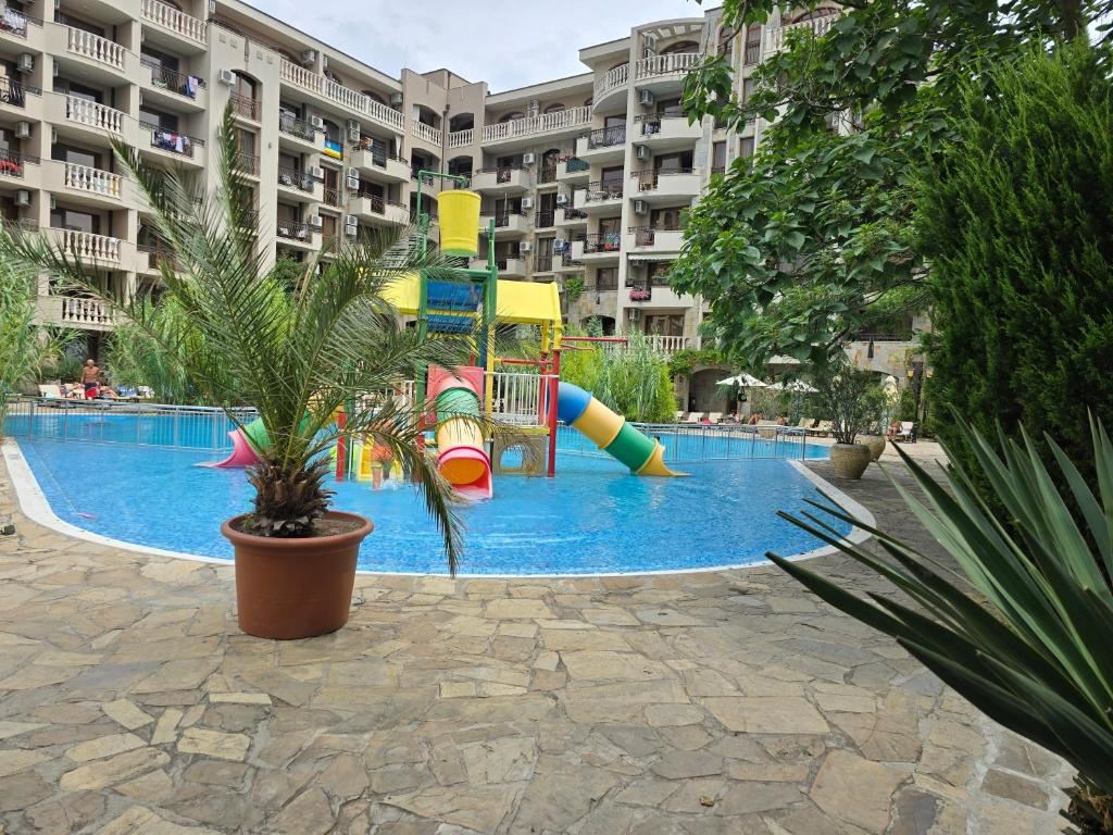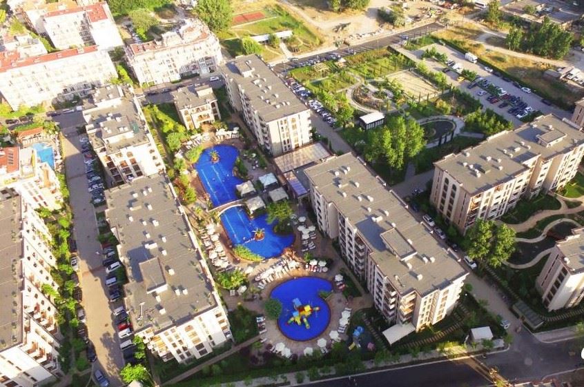 Комплексът, в който се намира имотът, е истинско бижу и се отличава с изключително богата и добре организирана инфраструктура. На територията му са разположени две изкуствени езера с обособени кътове за отдих, които създават усещане за спокойствие и близост до природата. За семействата с деца са предвидени четири детски площадки, както и осем басейна, равномерно разпределени из целия комплекс, осигуряващи лесен достъп и разнообразие от зони за релакс.