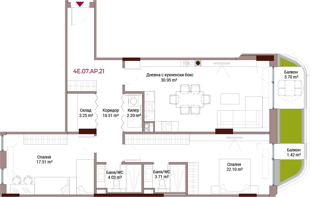 Представяме Ви тристаен апартамент на 7-ми етаж с разгъната застроена площ 122,27 м², обща площ 157,33 м² и площ с озеленени тераси 164,69 м². Жилището предлага непреходна елегантност и характерно излъчване, вдъхновено от емблематичната за София архитектура.