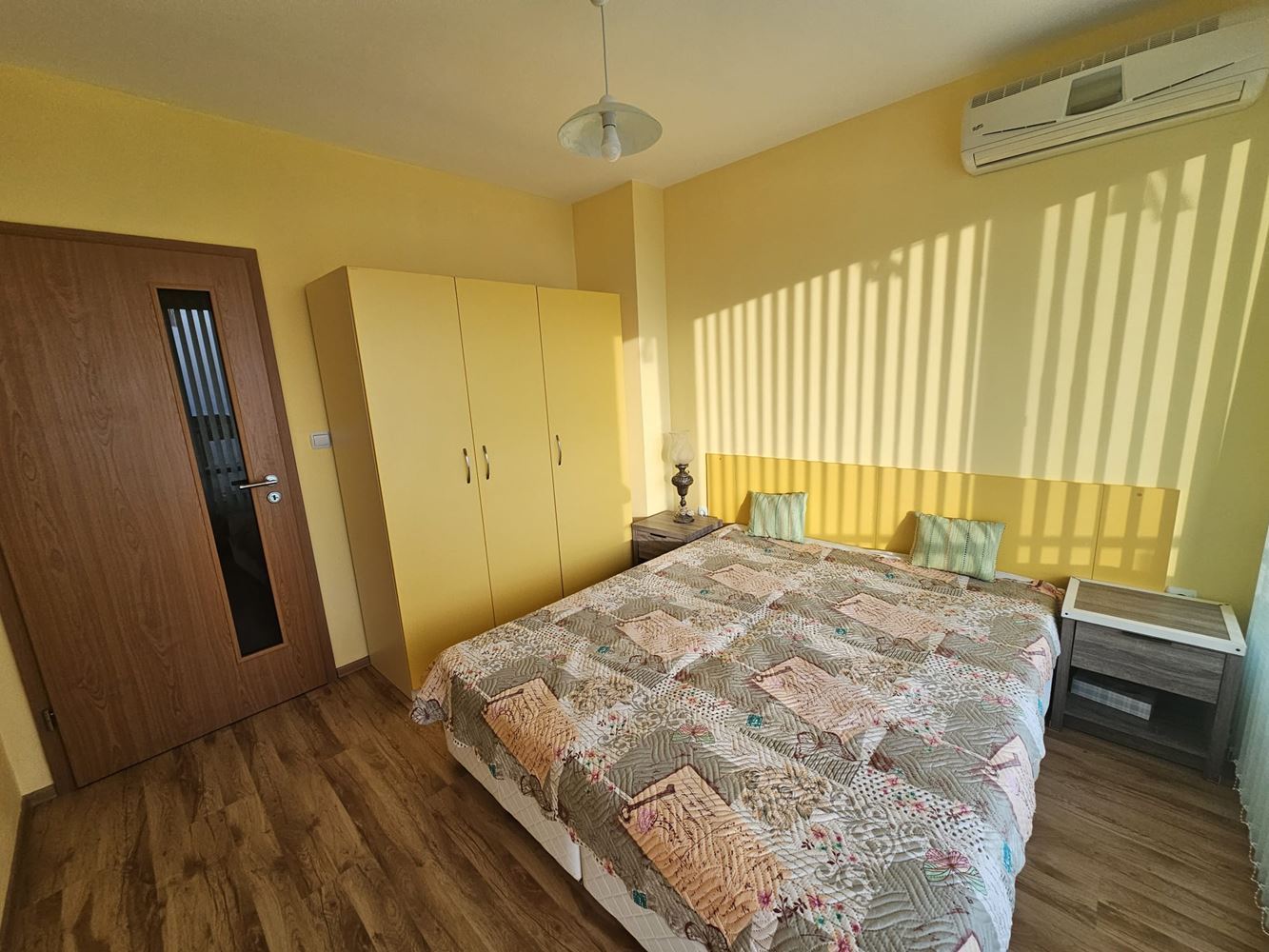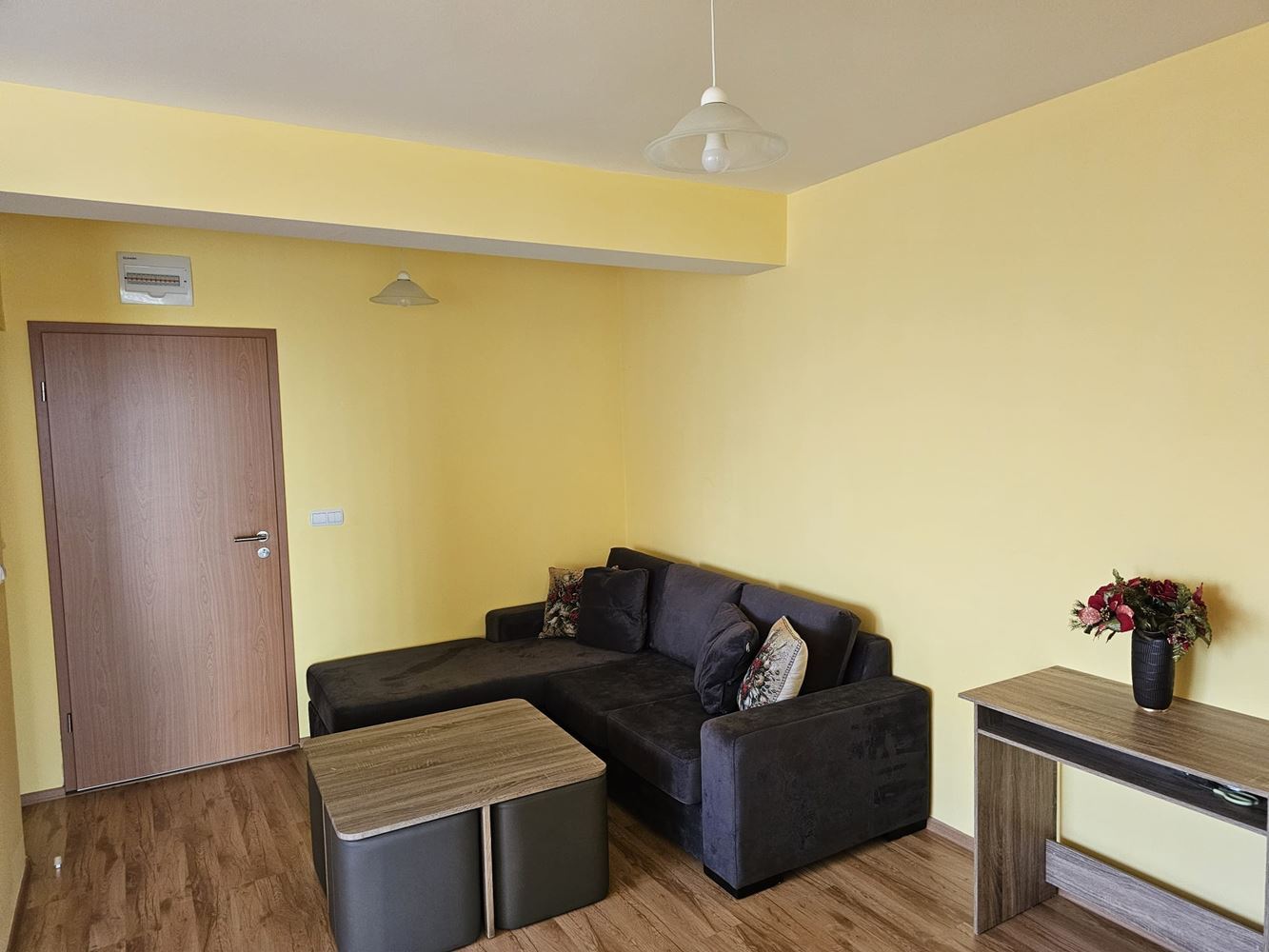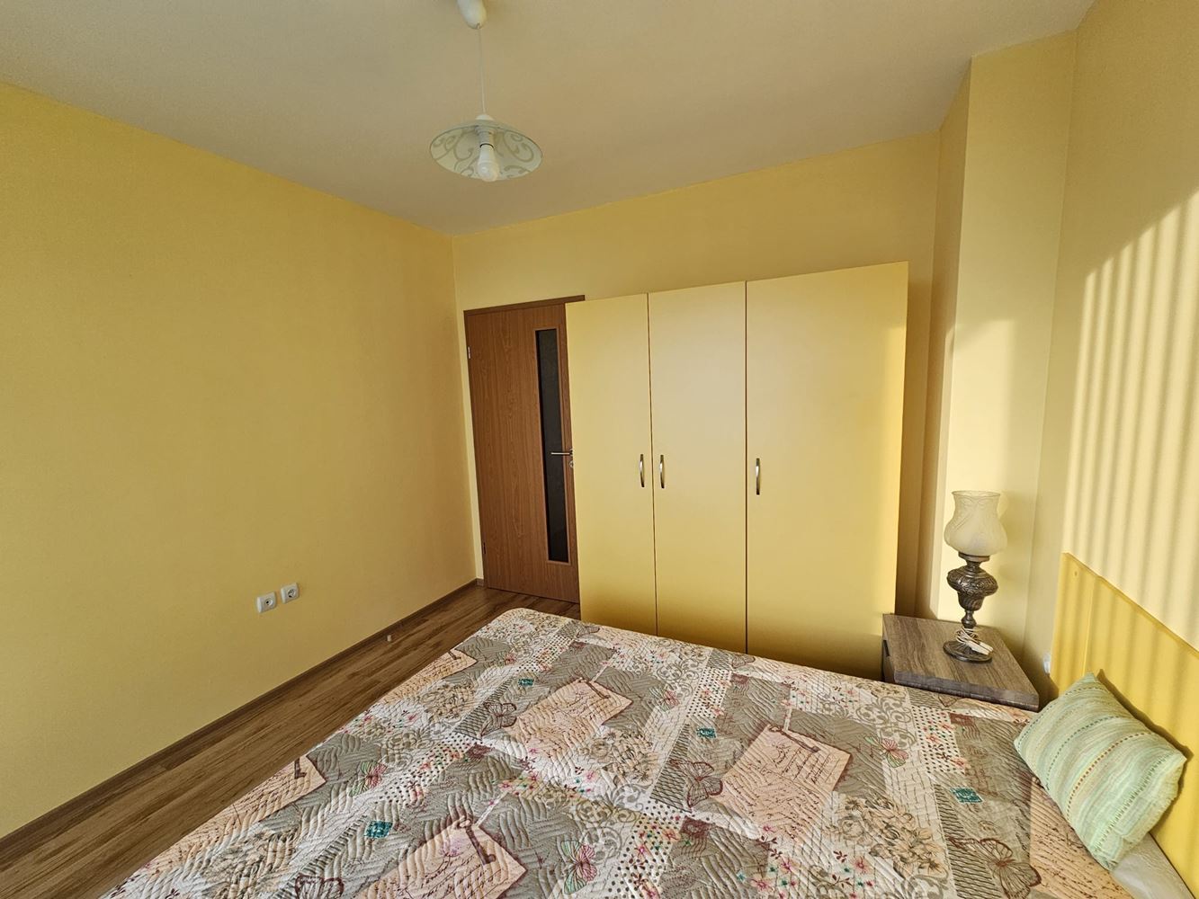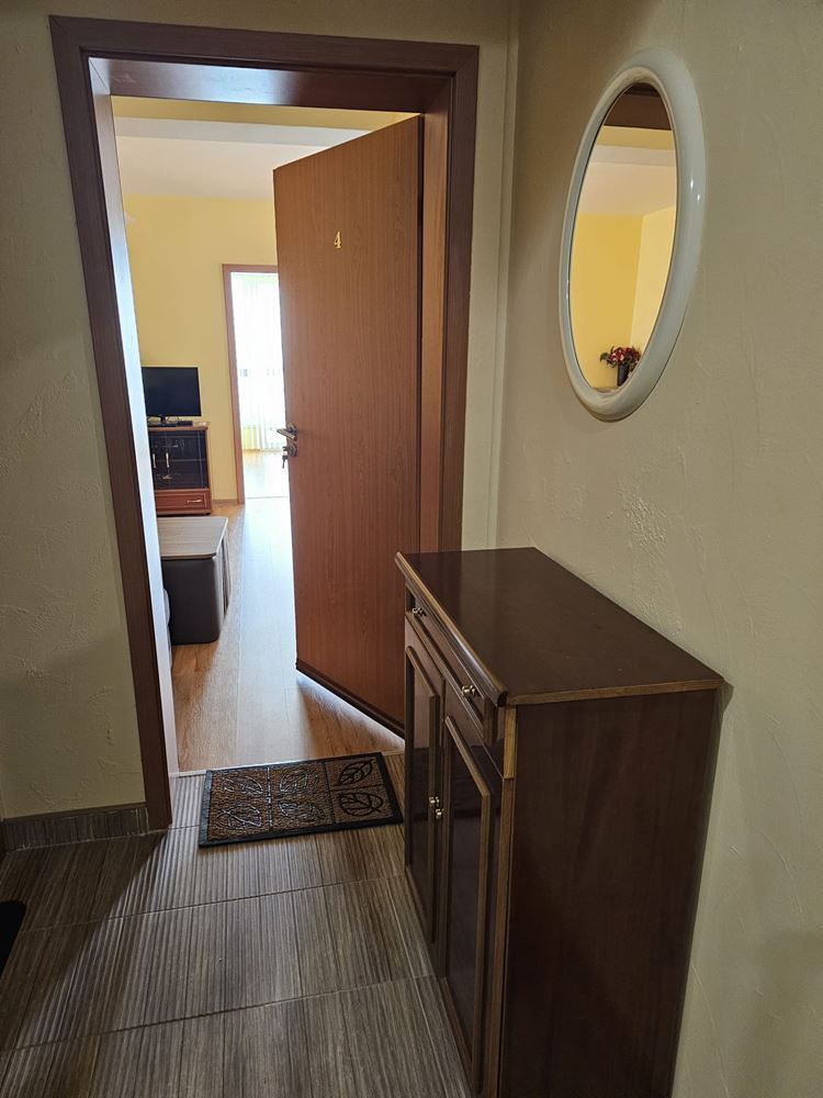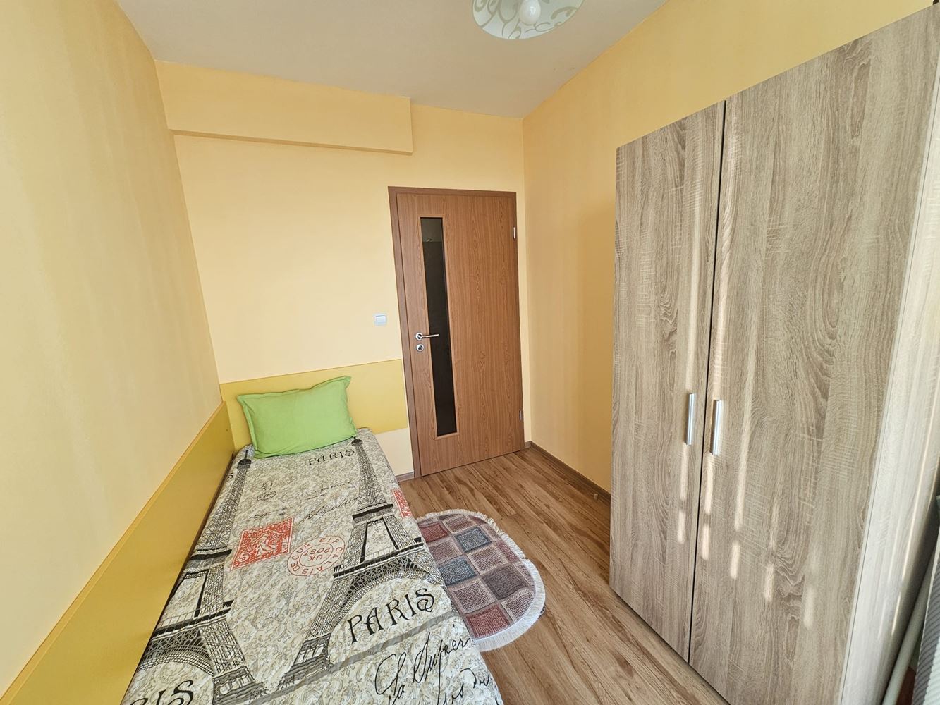 С обща площ от 62 м2 и функционално вътрешно разпределение, апартаментът се отличава с южно изложение, което осигурява обилна естествена светлина и приятен уют през целия ден. Разпределението включва входно антре, слънчева дневна с кухненски бокс и кът за хранене, две самостоятелни спални, баня с тоалетна и един удобен балкон с открита морска панорама – идеално място за сутрешно кафе или вечерна чаша вино с гледка. Имотът се продава напълно обзаведен и оборудван – готов за нанасяне веднага. Сградата е въведена в експлоатация (Акт 16), а жилището разполага с отделни партиди за ток и вода, както и цифров водомер – важни предимства за безпроблемно обитаване и ефективно управление на разходите.