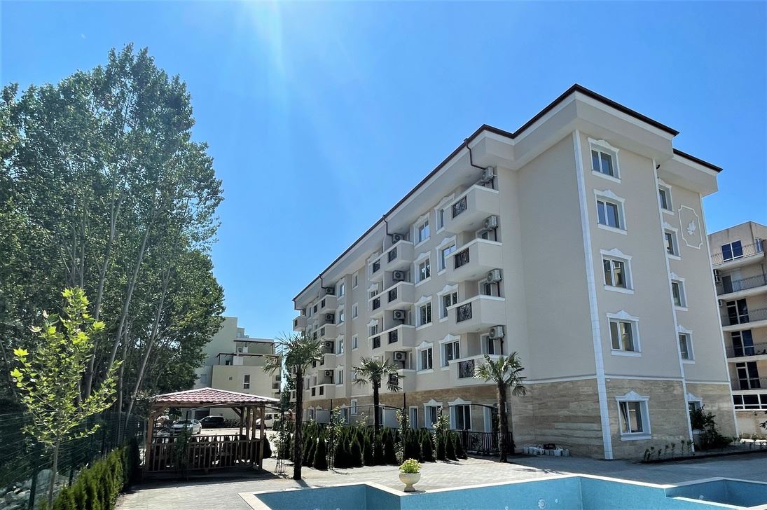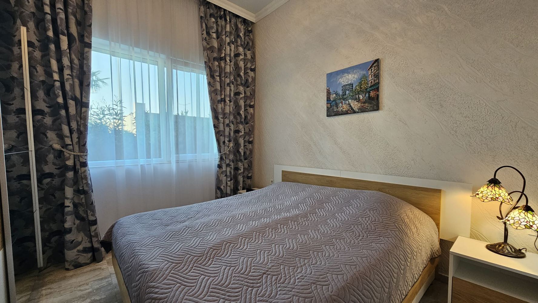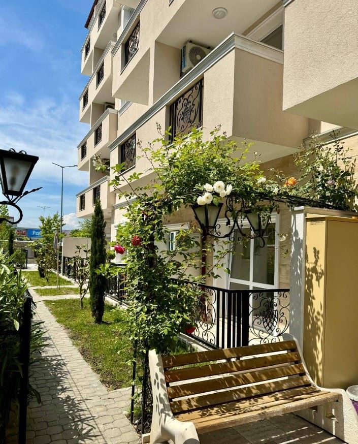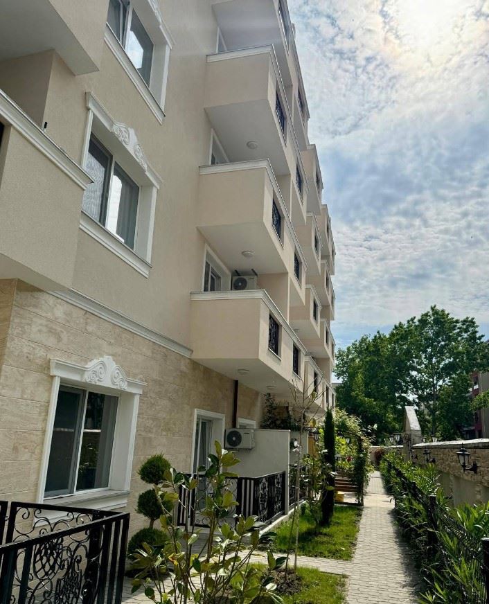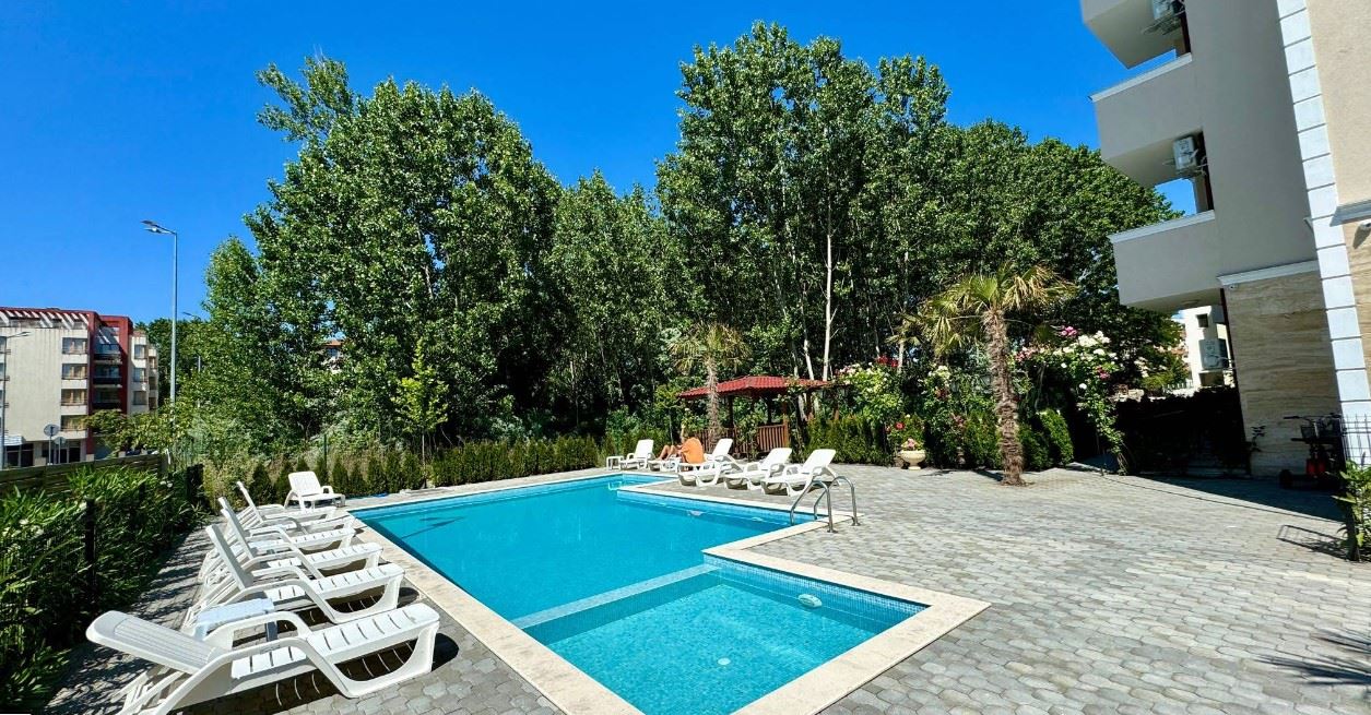 Предлагаме за продажба уютен двустаен апартамент на партерен етаж в престижен комплекс в Слънчев бряг. Имотът е напълно обзаведен и готов за нанасяне, а голямата тераса с директен излаз към двора носи усещане за простор, свобода и удобство – идеална за сутрешно кафе, зона за релакс или безопасно кътче за игра на деца и домашни любимци. С обща площ от 60.10 м2, жилището е функционално разпределено: входно антре, светла дневна с място за отдих и хранене, отделен кухненски кът, комфортна спалня, баня с тоалетна и просторна тераса/балкон. Дизайнът и обзавеждането са подбрани така, че да осигуряват максимален комфорт в ежедневието, а големите прозорци осигуряват приятна естествена светлина през деня.