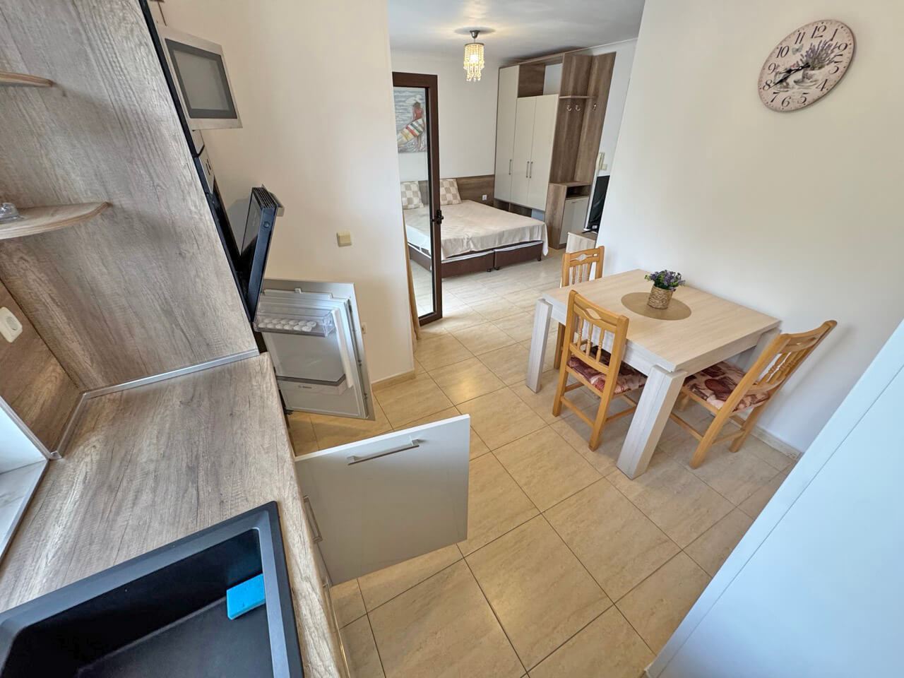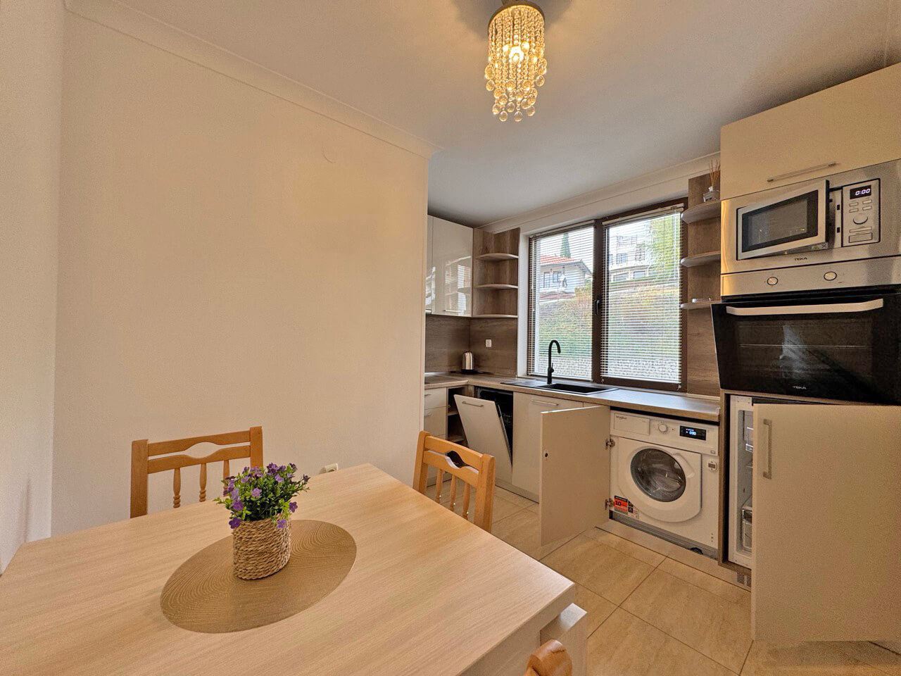 Студиото се продава напълно обзаведено и оборудвано, включително мебели, електроуреди и всичко необходимо за незабавно нанасяне. Интериорът е изпълнен с грижа към детайла и предоставя уютна атмосфера, която съчетава функционалност и стил. Пространството е добре организирано, позволявайки комфортно ежедневие и приятни моменти на релакс.