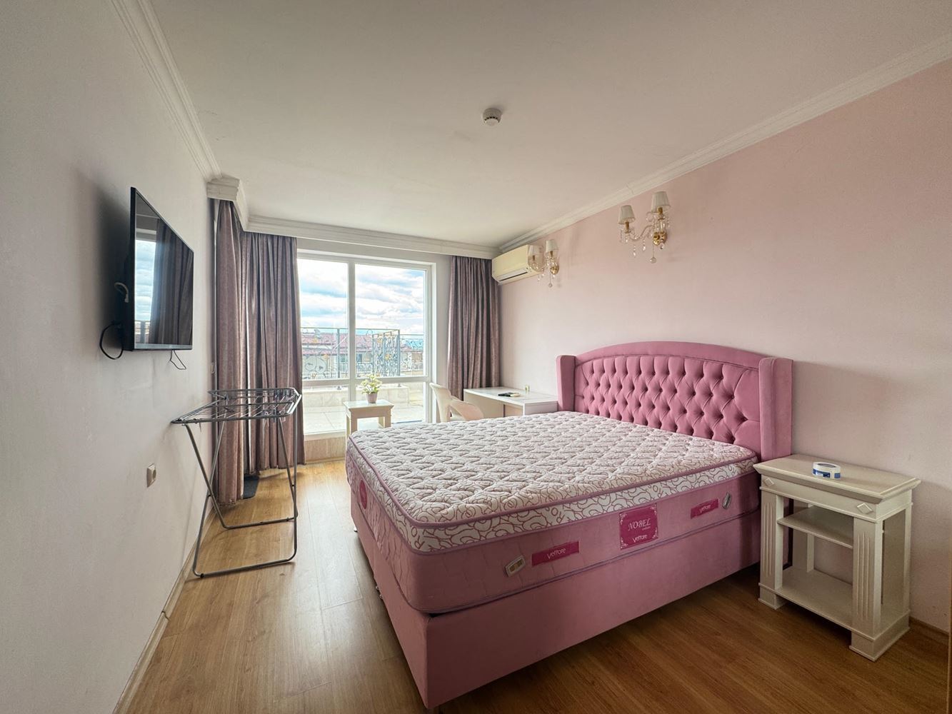 Светлият и широк балкон е перлата на този имот, предоставяйки голяма панорамна тераса, от която можете да се насладите на спиращите дъха гледки към морето и комплекса. Независимо дали предпочитате да се наслаждавате на сутрешното си кафе или вечерния прохладен бриз, това е мястото, където създавате незабравими спомени.