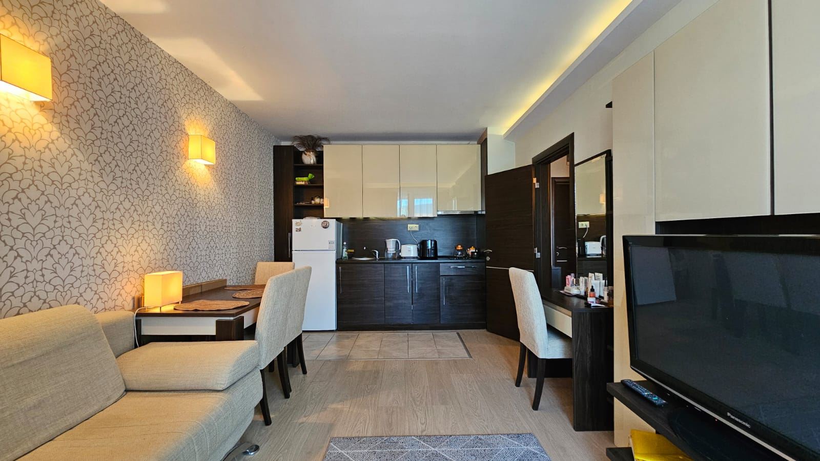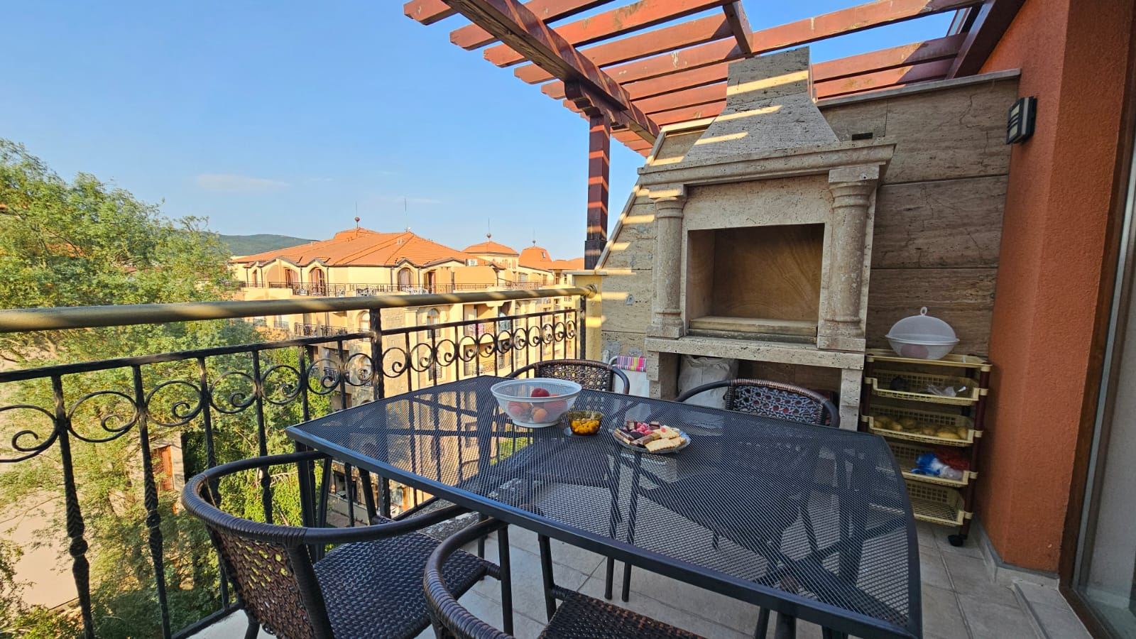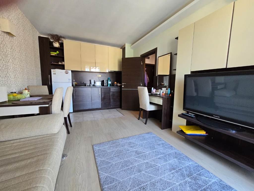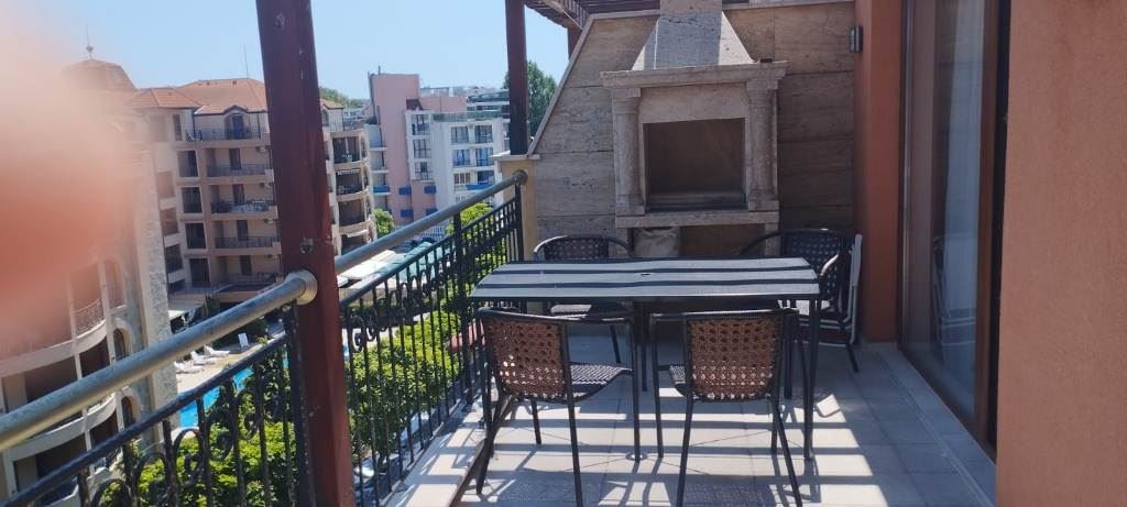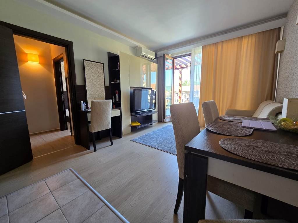 Предлагаме ви стилен и уютен двустаен апартамент в един от най-престижните луксозни комплекси в Слънчев бряг. С обща площ от 66 м², този имот, разположен на шести етаж, ви предлага несравними условия за живот и почивка. Апартаментът разполага с просторна и светла дневна, спалня, модерно обзаведена баня и приятен балкон с барбекю, от който се открива впечатляваща гледка към басейна и комплекса. Продава се напълно обзаведен с мебели и оборудване от висок клас, което ви позволява веднага да се насладите на комфорта и удобствата на собствения си дом.