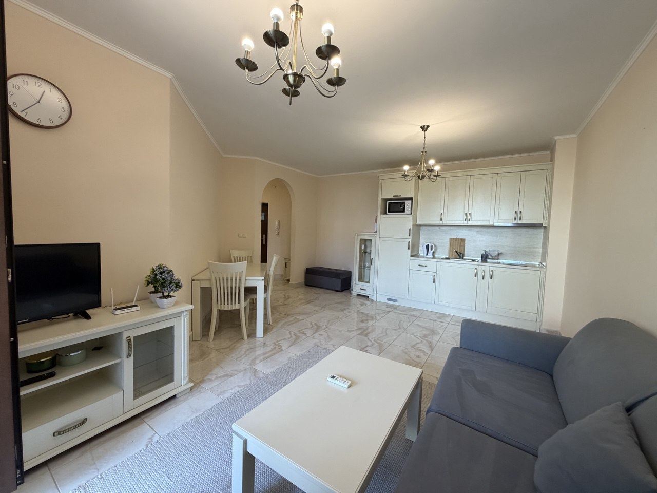 Апартаментът впечатлява със светла и просторна дневна зона, която плавно се свързва с кухненски кът, създавайки уютно и отворено пространство за живот, отдих и забавления. Спалнята е проектирана с внимание към детайлите и удобството, а банята е модерна и функционална. Особено внимание заслужава балконът, от който се открива красива гледка към градините и водните площи на комплекса, идеално място за сутрешно кафе или вечерен релакс.