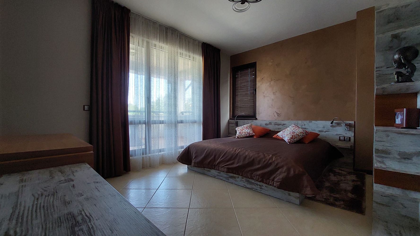 Жилището е модерно и стилно обзаведено, с внимание към всеки детайл и използване на висококачествени материали. Разпределението е изключително функционално и комфортно – просторна дневна с кухня и трапезария, изпълнена със светлина и с излаз към широка тераса, идеална за отдих и морски вечери. Двете спални са самостоятелни, уютни и разполагат със собствени тераси, които осигуряват лично пространство и спокойствие. Апартаментът разполага с две модерни бани с WC, проектирани в елегантен стил и напълно оборудвани.