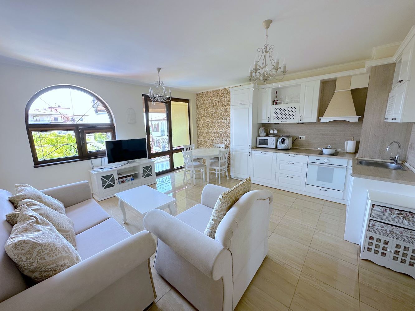 Тристаен апартамент с гледка море в луксозен комплекс в Несебър. Жилището е с площ 130 кв. м. на пети етаж. Състои се от антре, всекидневна с кухненски бокс, две спални, две бани с WC и две тераси. Апартаментът се напълно луксозно обзаведен, с подземно паркомясто. Инфраструктура и удобства в комплекса: целогодишна денонощна охрана с видеонаблюдение; рецепция и портиер услуги през цялата година; 3 бассейна - един с подгряване на водата и с джакузи, един с морска сол и един сладководен басейн; джакузи и зона за водни масажи; детска площадка, детска занималня, геймърски клуб, руски билярд; поддържан двор с много зеленина и зони за релакс; зона барбекю; поддръжка и почистване на зелените площи и зони около басейните; почистване на общите части; ползване на открит паркинг; лоби бар, ресторант; 4 магазина; Спа център; мини голф; тенис корт с осветление; боулинг зала; почасово гледане на деца; подземен гараж и открит паркинг; коли под наем; почистване на апартаментите - смяна на бельо, пране, гладене. Комплексът разположен на 300 м от плажа. На 400 метра от комплекса се намира водно-увеселителен парк - Аква Парадайс.