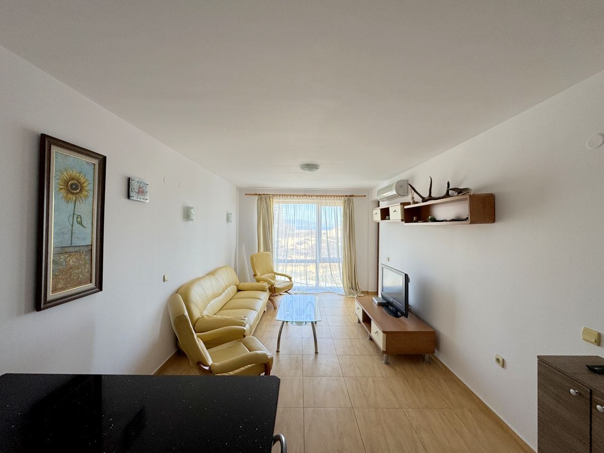 Представяме на Вашето внимание изключителен двустаен апартамент, разположен в сърцето на к.к. Слънчев бряг, с обща площ от 65 м². Този великолепен имот предлага комфорт и стил, съчетани със съвременните удобства и луксозното обзавеждане, което предоставя усещане за уют и елегантност. Апартаментът се състои от просторно антре, което води към светла и функционална кухня с трапезария. Удобната спалня е идеално място за отдих, а модерната баня с тоалетна предлага всички необходими удобства. Изисканата тераса предлага панорамна гледка към морето, което допълва изискания характер на това жилище.