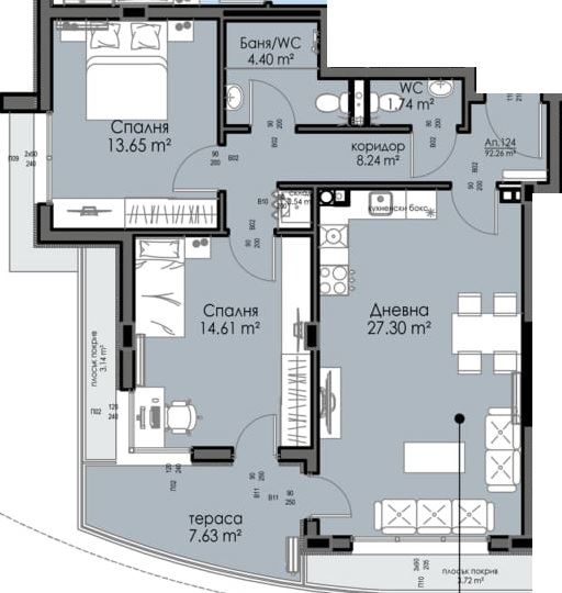 Жилището е с отлично функционално разпределение и включва просторен коридор, светла дневна с кухненска зона, две самостоятелни спални, баня с тоалетна, отделна тоалетна и тераса, подходяща за кът за отдих или зелена зона. Дневната зона е проектирана с усещане за простор и позволява обособяване на комфортен хол и трапезария. Двете спални дават възможност за гъвкавост – родителска спалня и детска стая, кабинет или стая за гости според нуждите на бъдещите собственици.