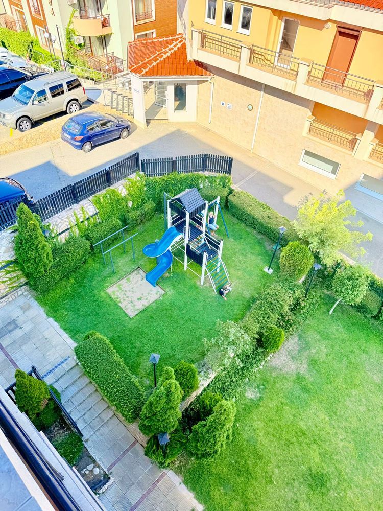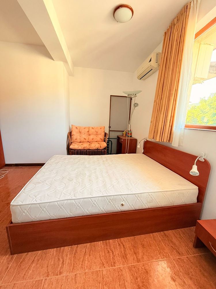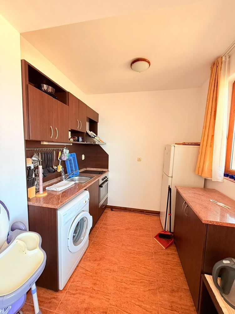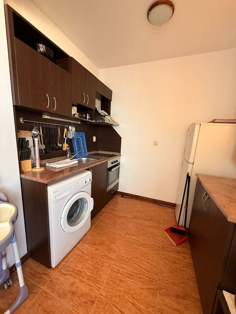 Жилището се състои от отделна спалня, просторна дневна с кухненски бокс и баня с тоалетна. Безспорно предимство на жилището е терасата с гледка към територия на комплекса, където можете да се насладите на сутрешното си кафе в уютна атмосфера. Имотът е в отлично състояние и е готов за целогодишно живеене или отдаване под наем, което го прави отлична възможност за инвестиция.