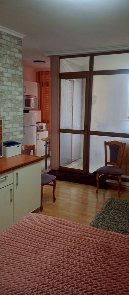 Представяме ви уютно и напълно обзаведено студио, разположено на четвърти етаж в добре поддържан жилищен комплекс, създаден да осигури спокойствие, сигурност и удобство за своите обитатели. Имотът е с обща площ от 48,84 м², като пространството е функционално организирано и подходящо както за лично ползване, така и за инвестиция с цел отдаване под наем. Студиото е светло и просторно, с добре обособени зони за почивка, хранене и релакс. Жилището се предлага напълно обзаведено, което позволява незабавно нанасяне без допълнителни разходи. От имота се разкрива гледка към съседен комплекс, осигуряваща тиха и приятна атмосфера, далеч от шума на натоварени улици.