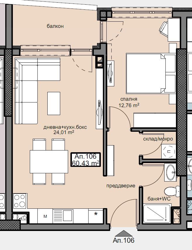 Жилището се състои от дневна с кухненска част, уютна спалня, баня с тоалетна, склад/мокро помещение и коридор. Особено удобство представлява тераса с излаз от двете стаи, която осигурява допълнителна светлина и възможност за отдих на открито. Апартаментът се издава по БДС, на тапа, което дава възможност на собственика да завърши интериора според личния си вкус.