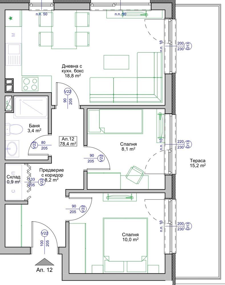 Жилището предлага функционално и удобно разпределение: входно антре, просторна дневна с кухня, две самостоятелни спални, баня с WC, килер и голяма тераса. И от трите стаи има директен излаз към терасата – чудесно място за сутрешно кафе, следобеден отдих или вечеря на открито. Вътрешните пространства са балансирани и осигуряват комфорт и уединение за всеки член на семейството. Апартаментът се продава на тапа, което ви дава ценната възможност да изберете собствен стил на довършителни работи и да създадете дом, който отразява вашия вкус. Сградата ще бъде с асансьор за максимално удобство на живущите.