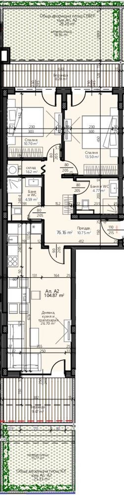 Предлагаме за продажба просторен тристаен апартамент в новострояща се бутикова сграда в предпочитана и тиха част на кв. Сарафово, Бургас. Локацията съчетава спокойствие, простор и изцяло нова инфраструктура, като плажната ивица е на няколко минути пеша. Имотът е отличен избор както за лично ползване, така и като инвестиция с потенциал за доход от краткосрочни и дългосрочни наеми. Апартаментът е с впечатляваща обща площ от 147.13 м2 на партер и функционално вътрешно разпределение: кухня – дневна – трапезария, две самостоятелни спални, две бани с WC, складово помещение, коридор, както и две веранди с прилежащо дворно място към тях – идеално за сутрешно кафе, семейни обеди или спокойни вечери на открито. Двете открити пространства добавят усещане за къща в градска среда и са истински бонус на няколко крачки от морето.