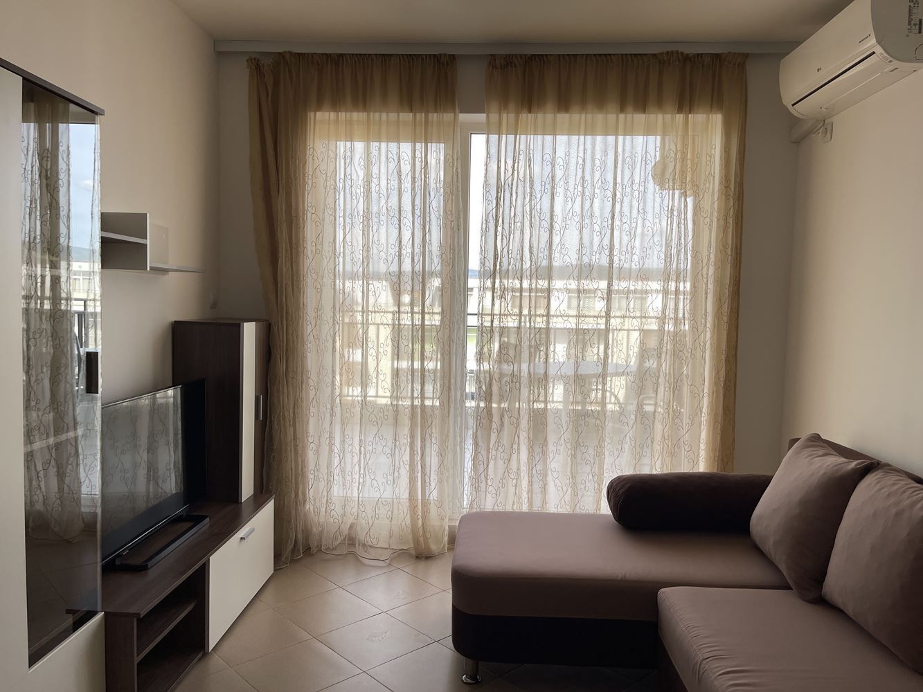 Двустаен апартамент в затворен комплекс в Слънчев бряг, в централната част на курорта, само на 7-8 минути пеша от морето и плажа. В непосредствена близост се намират магазини, супермаркети, банка, медицински център, аптека, кафенета и спирки на градския транспорт. Площта на апартамента е 60 кв. м. То включва входно антре, дневна с кухня, отделна спалня, баня с тоалетна и голям балкон с изглед към басейна. Жилището се продава обзаведено, оборудвано и напълно завършено. Банята е оборудвана със санитарен фаянс. Жилището е напълно готово за живеене. Комплексът разполага с плувни басейни за възрастни и деца, фитнес зала, детска площадка, ресторант, тенис корт, охрана и паркинг.