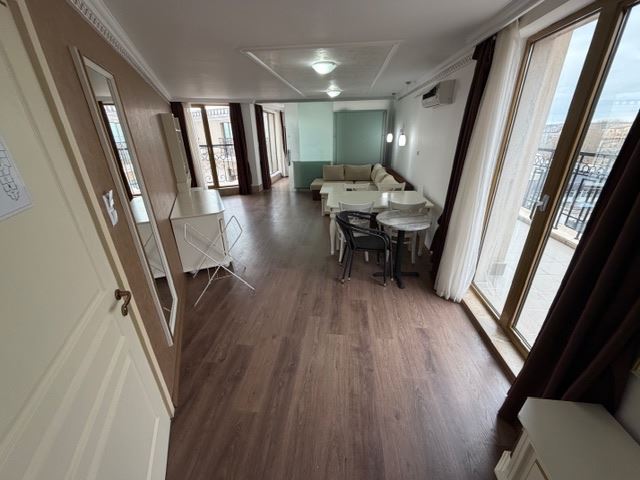 Предлагаме ви изключителен двустаен пентхаус с обща площ 106,28 м², разположен на осми, последен етаж в елегантен и поддържан комплекс на първа линия в курорта Слънчев бряг. Имотът съчетава уникално местоположение, стилна архитектура и луксозен интериор, създаден да отговори и на най-високите изисквания за комфорт, престиж и качество на живот. Апартаментът впечатлява с просторни и светли помещения, функционално разпределени, които осигуряват усещане за свобода и уют. Дневната зона е идеално място за отдих и събиране с близки, а спалнята предлага тишина и спокойствие след дълъг ден край морето. Едната тераса разкрива красива гледка към морето, където можете да се наслаждавате на вълшебни изгреви и шума на вълните, докато втората тераса е ориентирана към дюните, създавайки допълнително усещане за простор, природа и уединение.