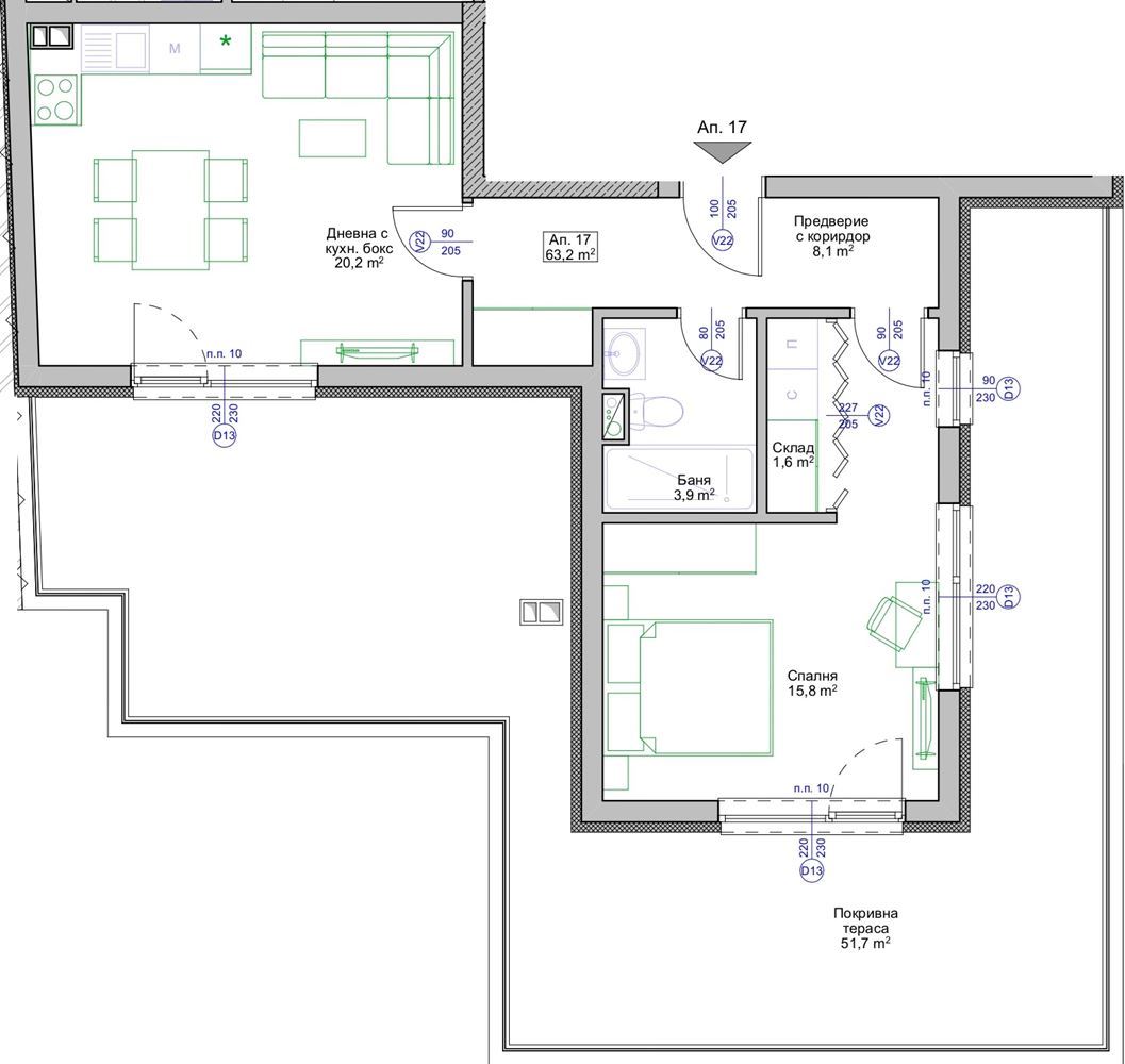 Апартаментът е двустаен, с обща площ 128.89 кв.м и функционално разпределение: просторна дневна с кухненски кът и директен излаз към огромна тераса, самостоятелна спалня с излаз на тераса, баня с тоалетна, килер и удобно входно антре. Жилището се продава на тапа, което ви дава свободата да го завършите по ваш вкус и стандарт. Сградата разполага с асансьор, а предвидените гаражи и паркоместа осигуряват удобство за паркиране.