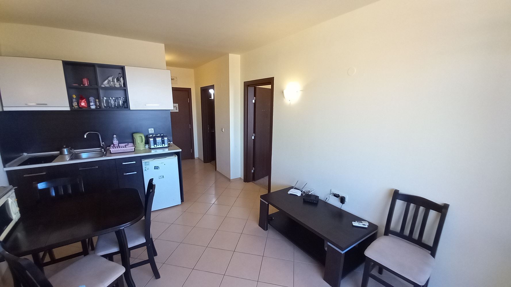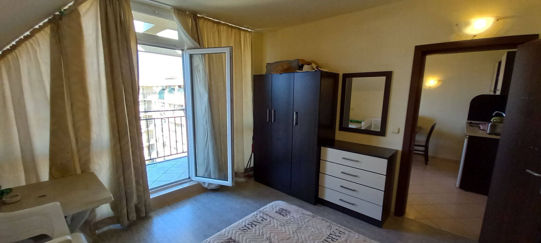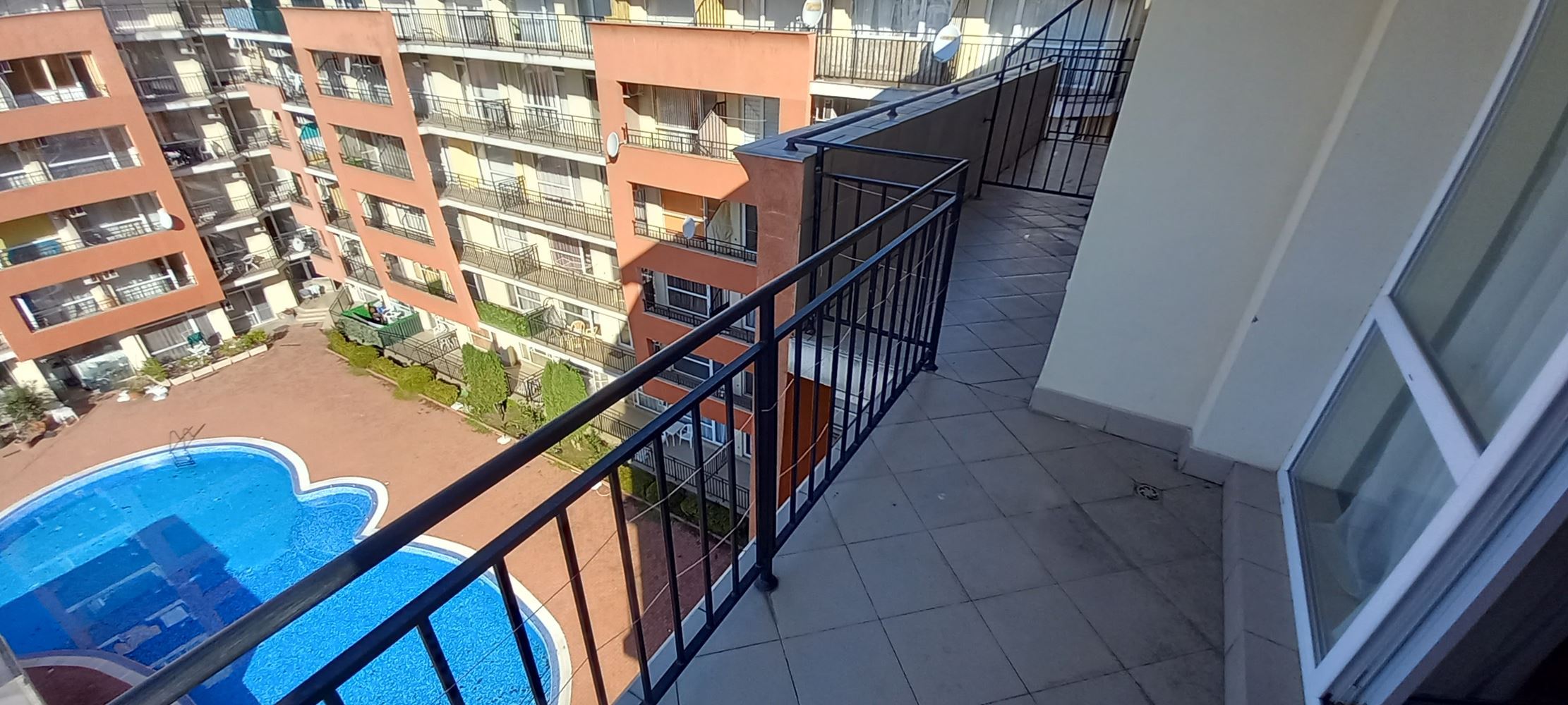 Панорамен тристаен с гледка към басейна на последен етаж в к.к. Слънчев бряг – обзаведен и готов за нанасяне
