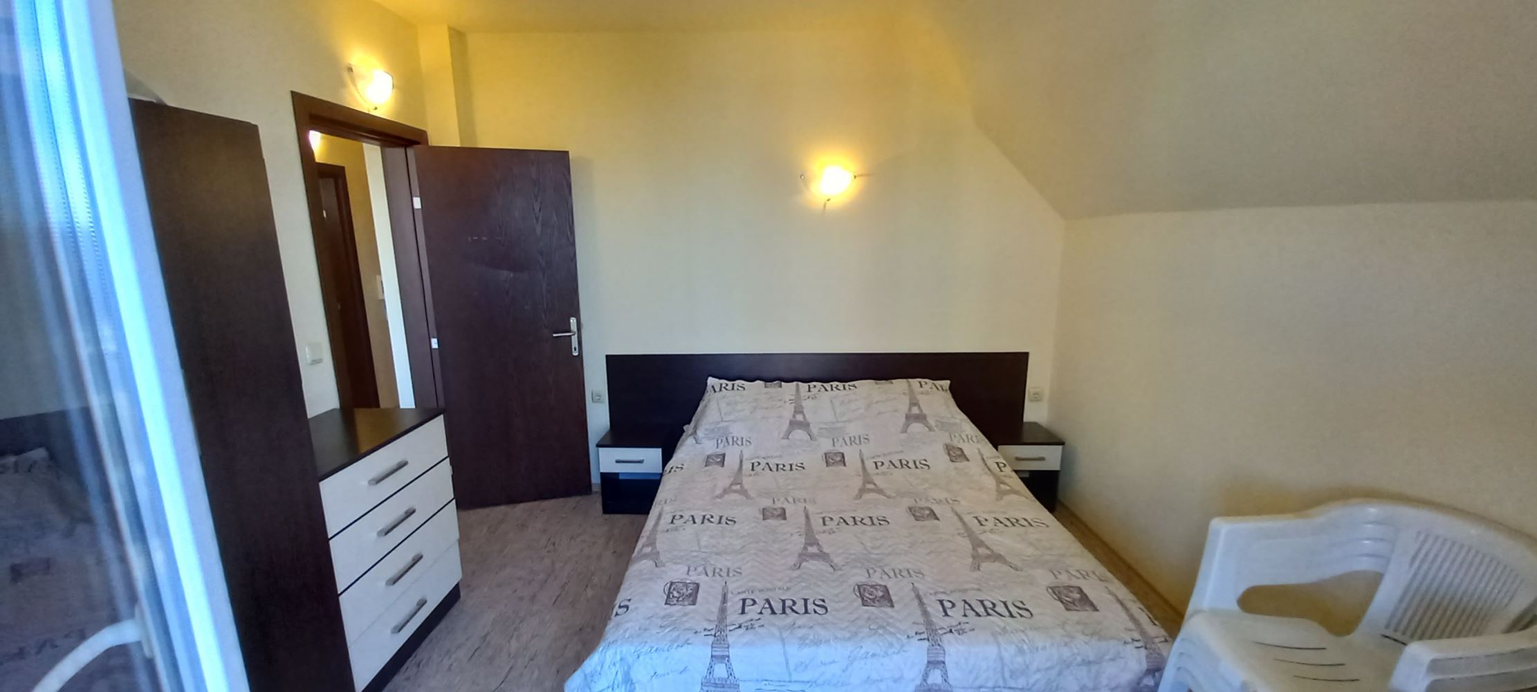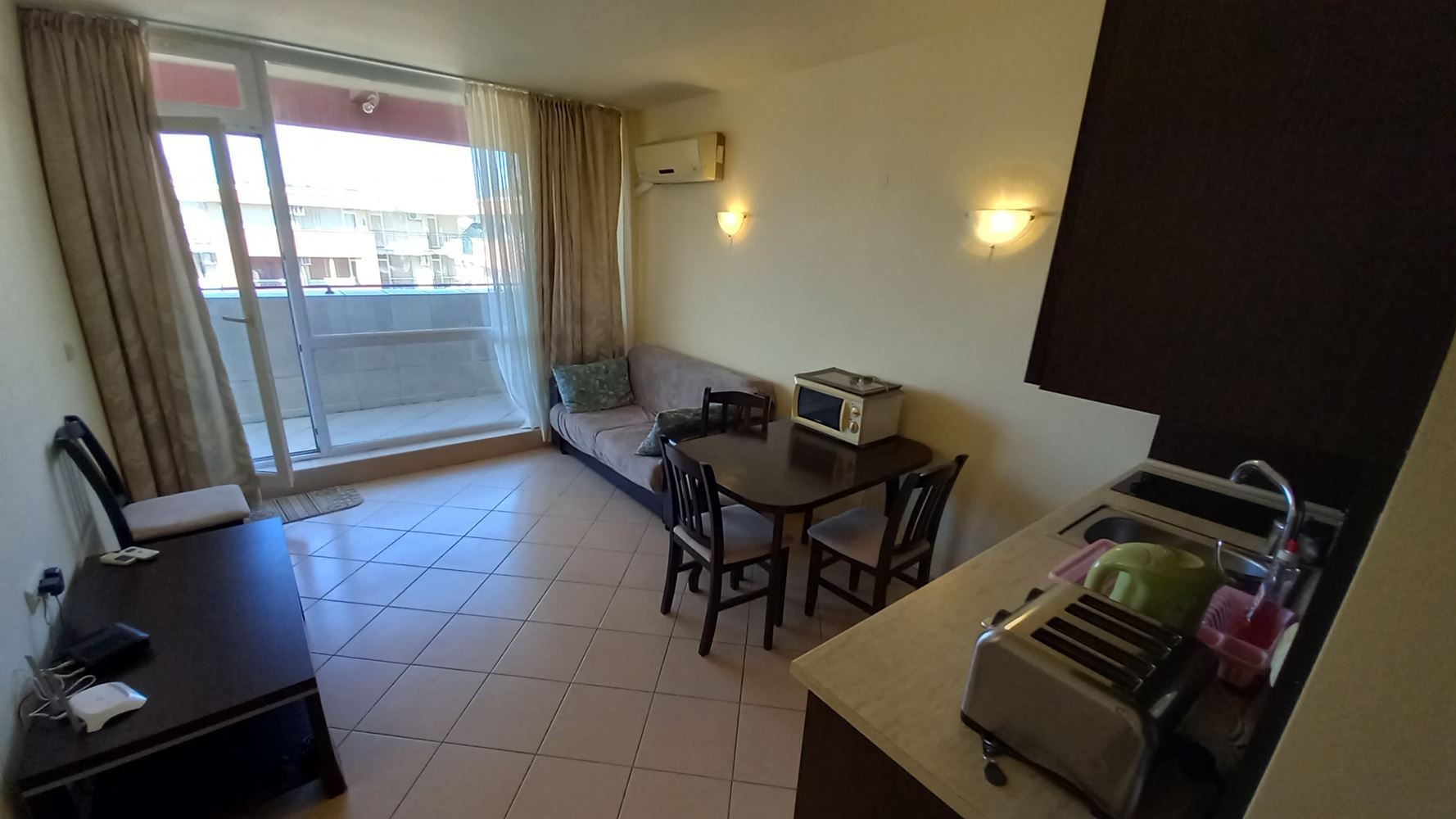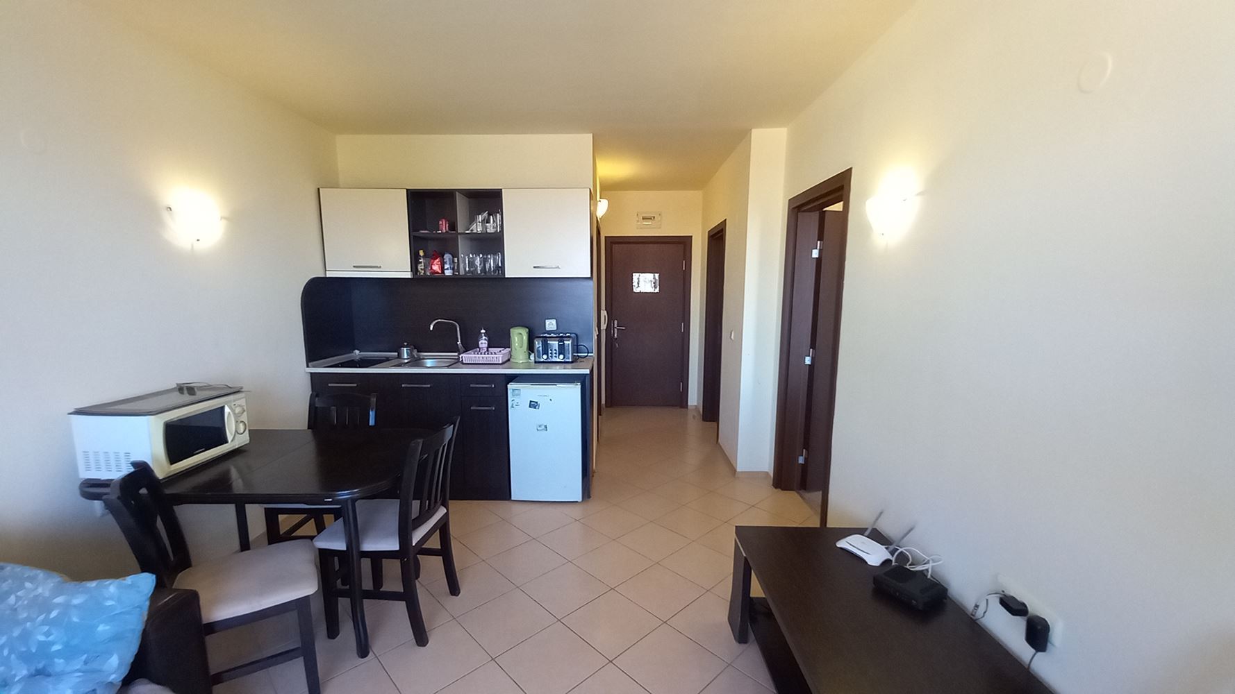 Панорамен тристаен с гледка към басейна на последен етаж в к.к. Слънчев бряг – обзаведен и готов за нанасяне