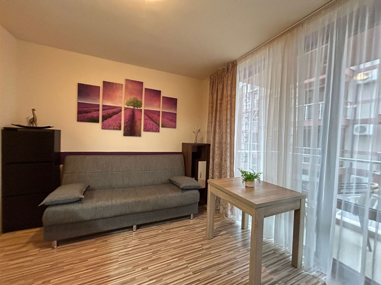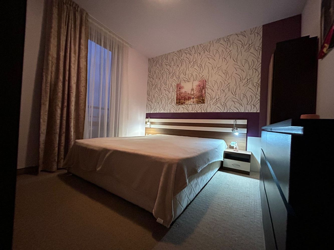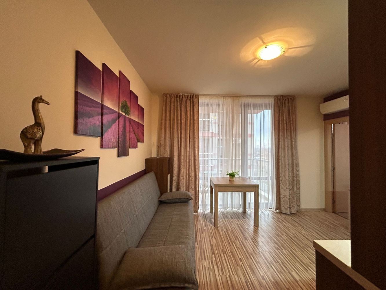 Предлагаме за продажба двустаен апартамент с площ от 46 м2, разположен на трети етаж в добре поддържан комплекс. Имотът предлага комфортно и функционално разпределение, включващо просторна всекидневна с кухня, уютна спалня, баня и балкон, от който се открива красива гледка към комплекса и околната територия. Апартаментът се продава с мебели и електроуреди, като е в перфектно състояние, готов за незабавно нанасяне или отдаване под наем.