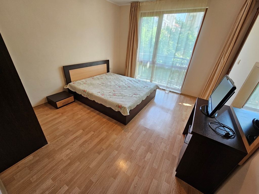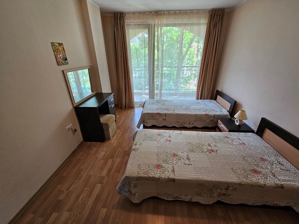 Прекрасен и просторен тристаен апартамент в луксозния комплекс, разположен в тихата северна част на к.к. Слънчев бряг. Този имот предлага удобство и комфорт, съчетани с неповторима атмосфера и възможности за релакс. Апартаментът разполага с обща площ от 99 м², разпределена функционално на ри стаи, включващи просторна всекидневна и две уютни спални. На разположение са и две модерни бани, които осигуряват максимално удобство на обитателите. От двете спални се открива гледка към зелените градини на комплекса, докато всекидневната предлага живописен изглед към басейна. Двата балкона предоставят идеална възможност за сутрешно кафе или вечерен релакс на открито.