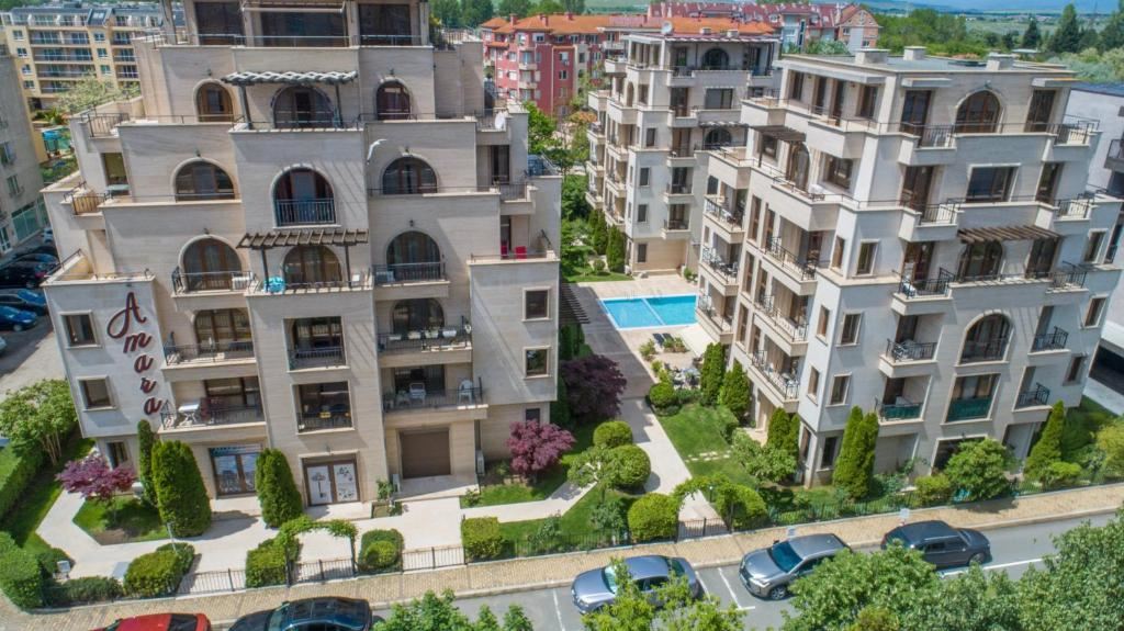 Комплексът предлага широк спектър от удобства, създаващи усещане за лукс и курортна атмосфера. На територията има голям външен басейн за възрастни, отделна детска част на басейна и детска площадка, което го прави идеален за семейства с деца. Просторните зелени площи и добре поддържаните алеи осигуряват спокойствие и възможности за разходки сред красиво озеленена среда.
