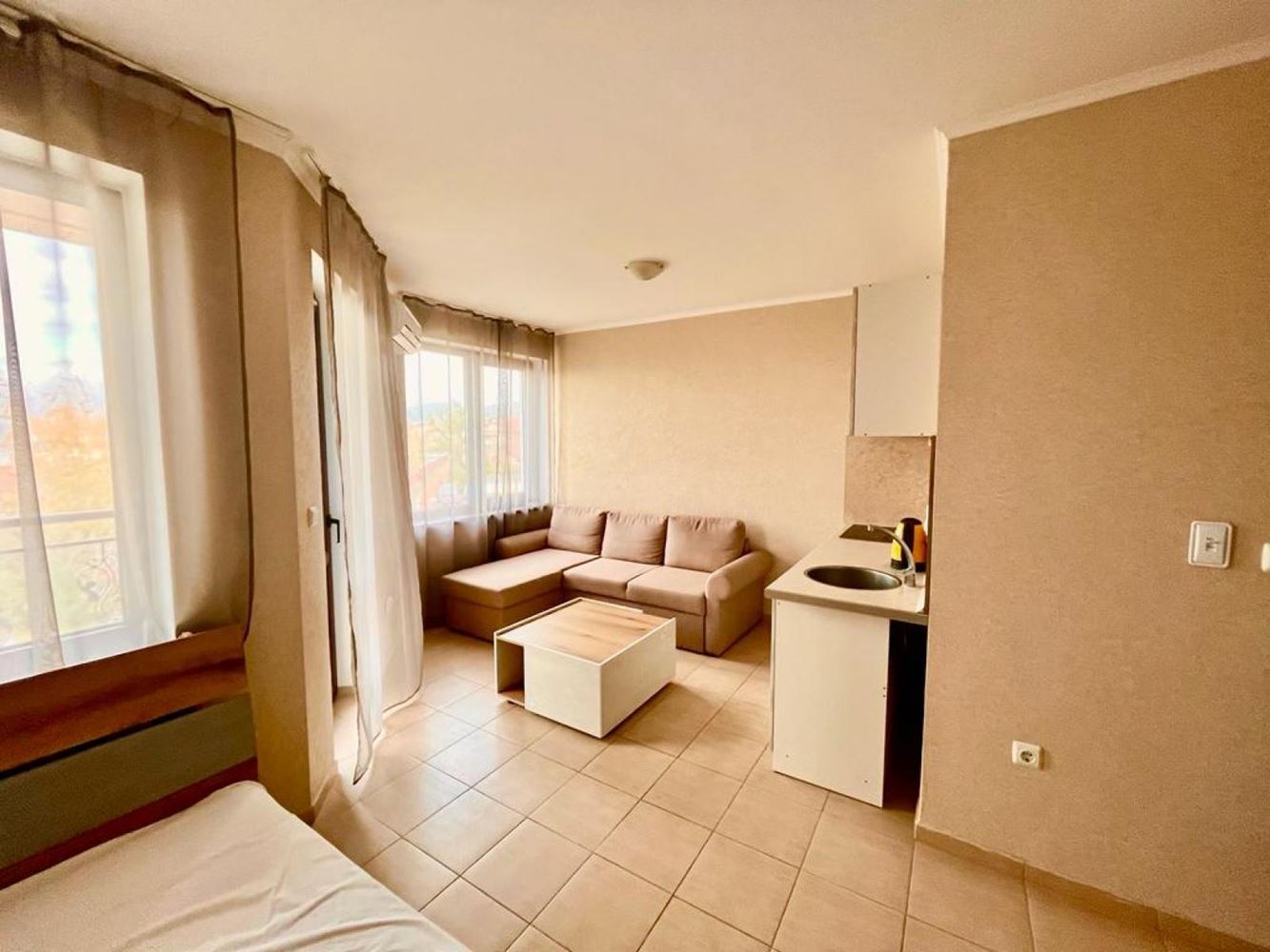Този великолепен жилищен комплекс, издигащ се на 120 метра над морското равнище, предлага уникална комбинация от лукс и природна красота. Студиото, разположено на третия етаж на този комплекс, представлява уютно пространство от 36 кв. м, атрактивно обзаведено и оборудвано с цялото необходимо оборудване. От студиото се открива хипнотизираща гледка към планината и курорта Слънчев бряг, която създава атмосфера на спокойствие и вдъхновение. Зелените хълмове около комплекса създават неповторим фон на това уникално място. Инфраструктурата на комплекса е проектирана с мисъл за всички нужди на неговите обитатели. Ландшафтът, откритите басейни и терасите дават възможност да се насладите на чистия въздух и слънчевите дни, а ресторантът, магазинът и фитнес центърът осигуряват комфорт и удобство в ежедневието. СПА центърът и 24-часовата охрана гарантират, че обитателите могат да се насладят на моменти на релаксация, без да се притесняват за сигурността. За удобство на собствениците на автомобили е осигурен паркинг, а достъпът до природния резерват Калината и заобикалящата го природа позволява да се насладите на пешеходни преходи и приключения на открито. Този жилищен комплекс е перфектната комбинация от лукс, комфорт и природна красота, създавайки идеалното пространство за живот и почивка на море.