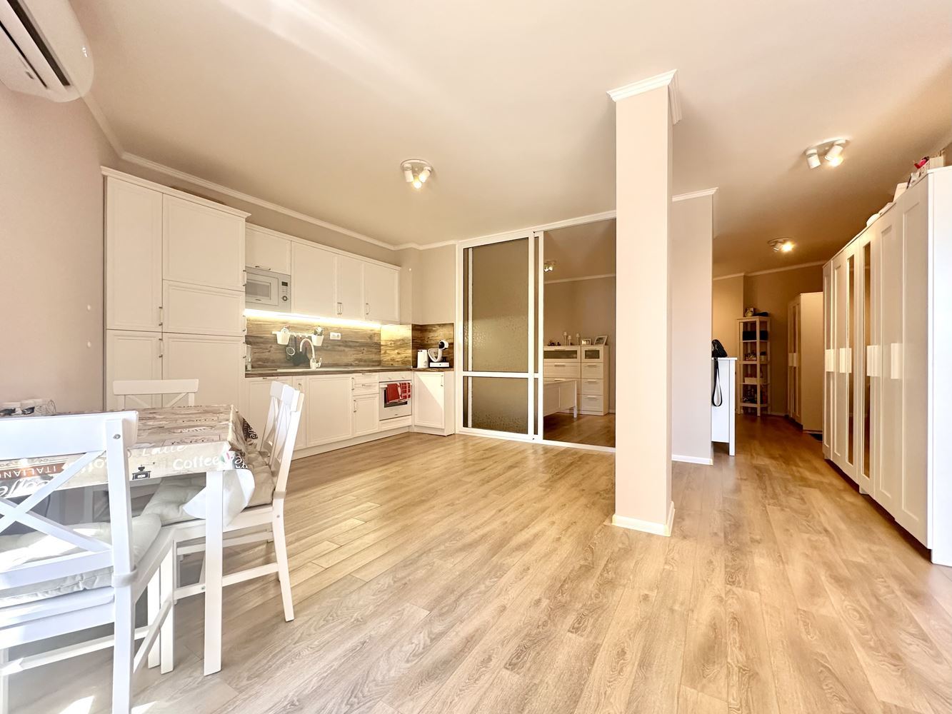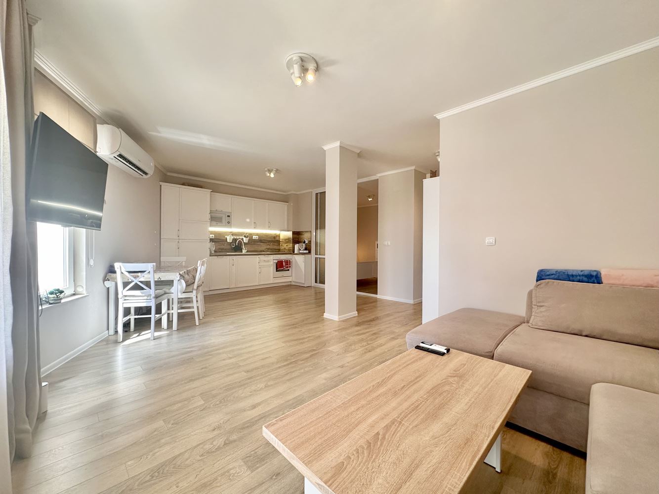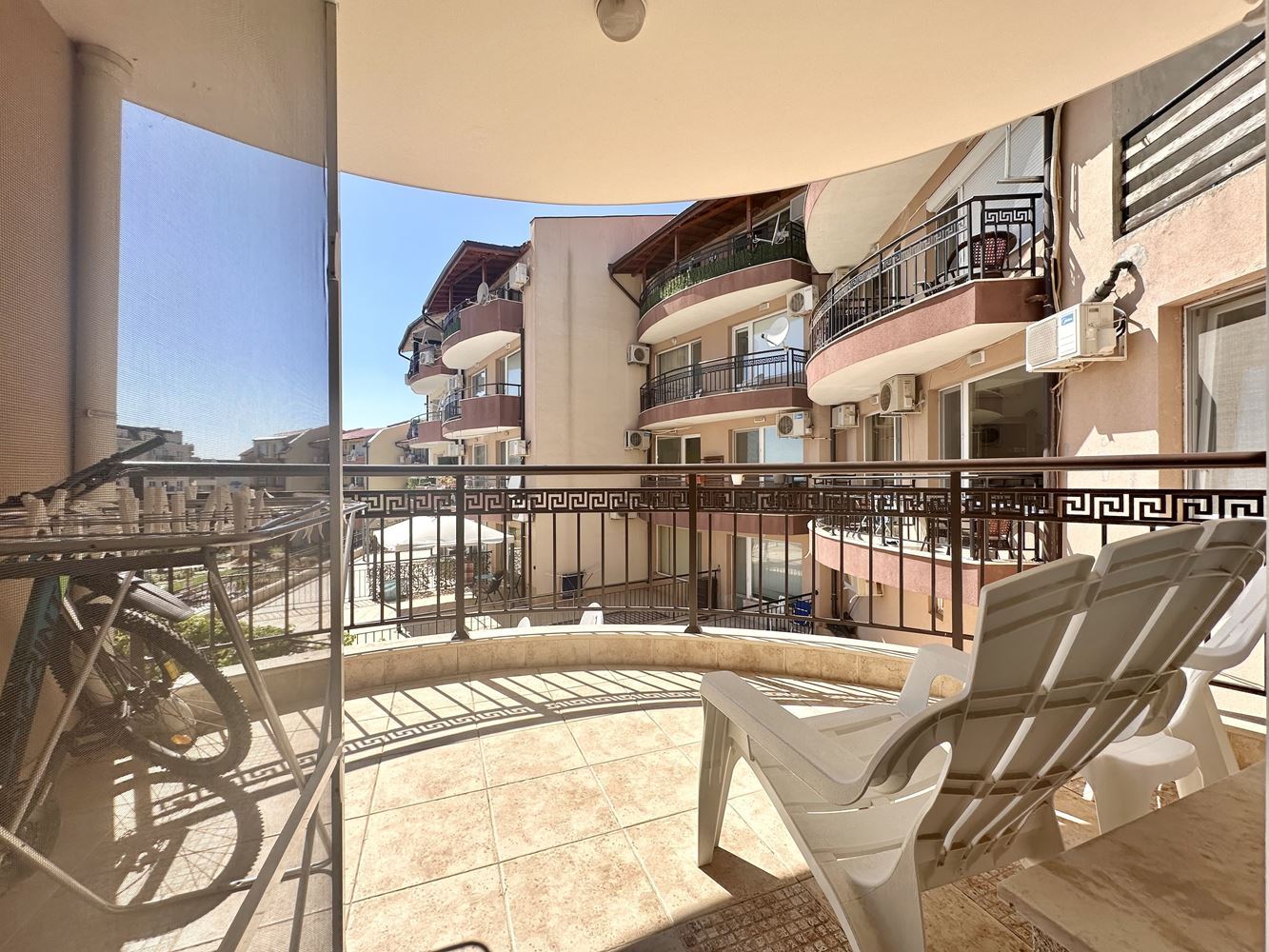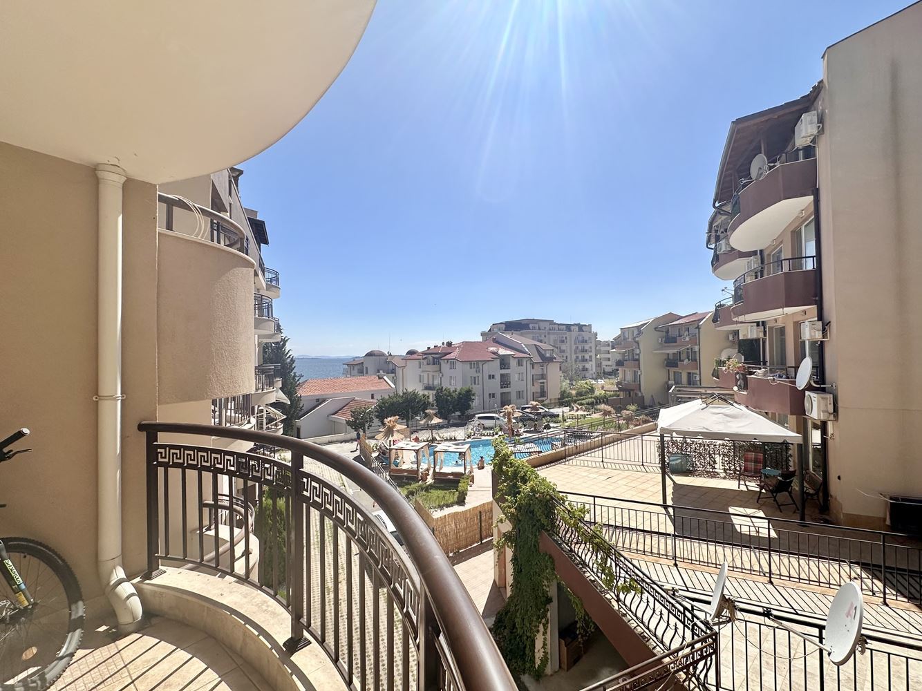 Жилището впечатлява със своята просторност и функционално разпределение, създаващо усещане за свобода и светлина. Големите прозорци разкриват красива гледка към басейна и морето, която превръща всеки ден в удоволствие. Това е място, където можете да се насладите на сутрешното си кафе с морски хоризонт или да релаксирате вечер в спокойна и уютна атмосфера.