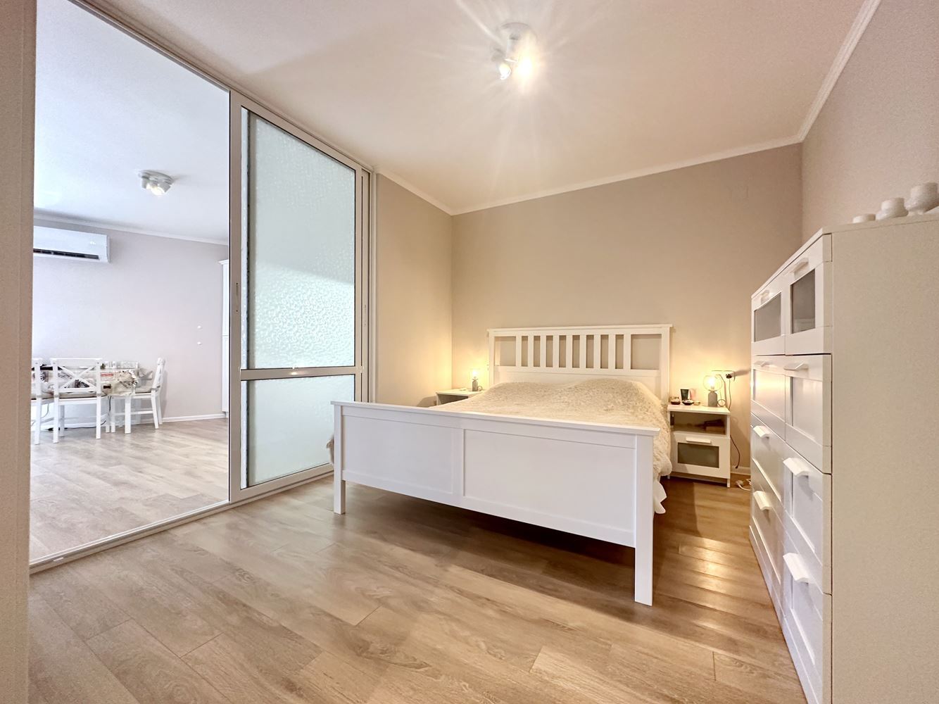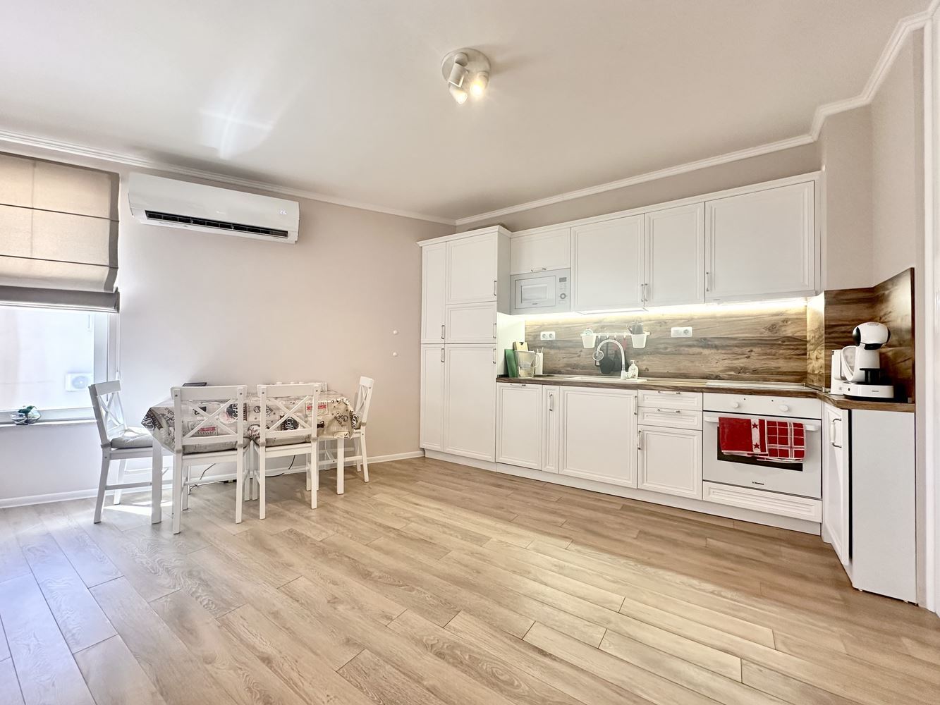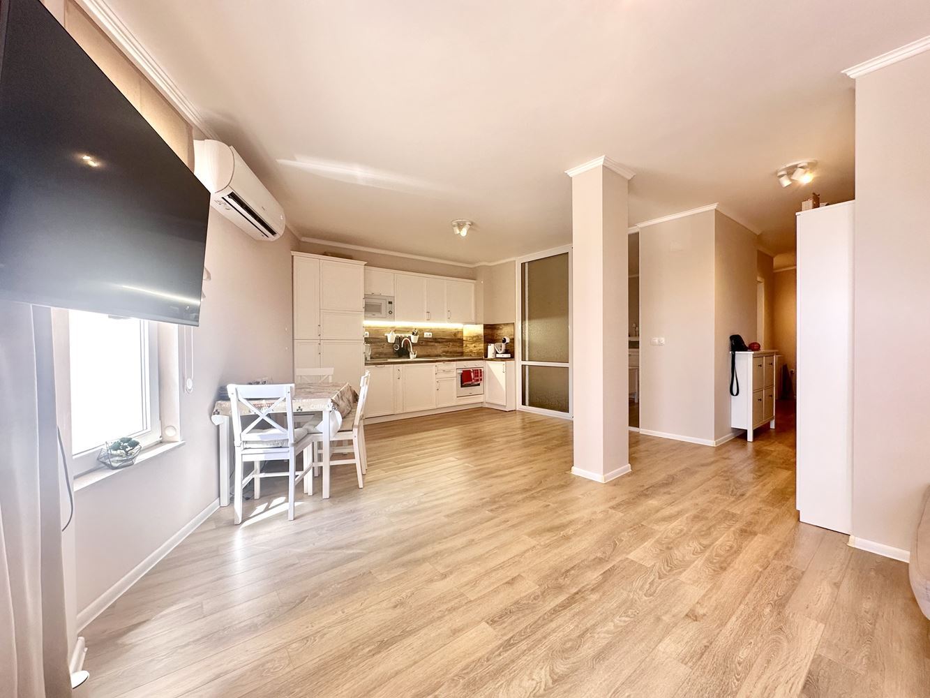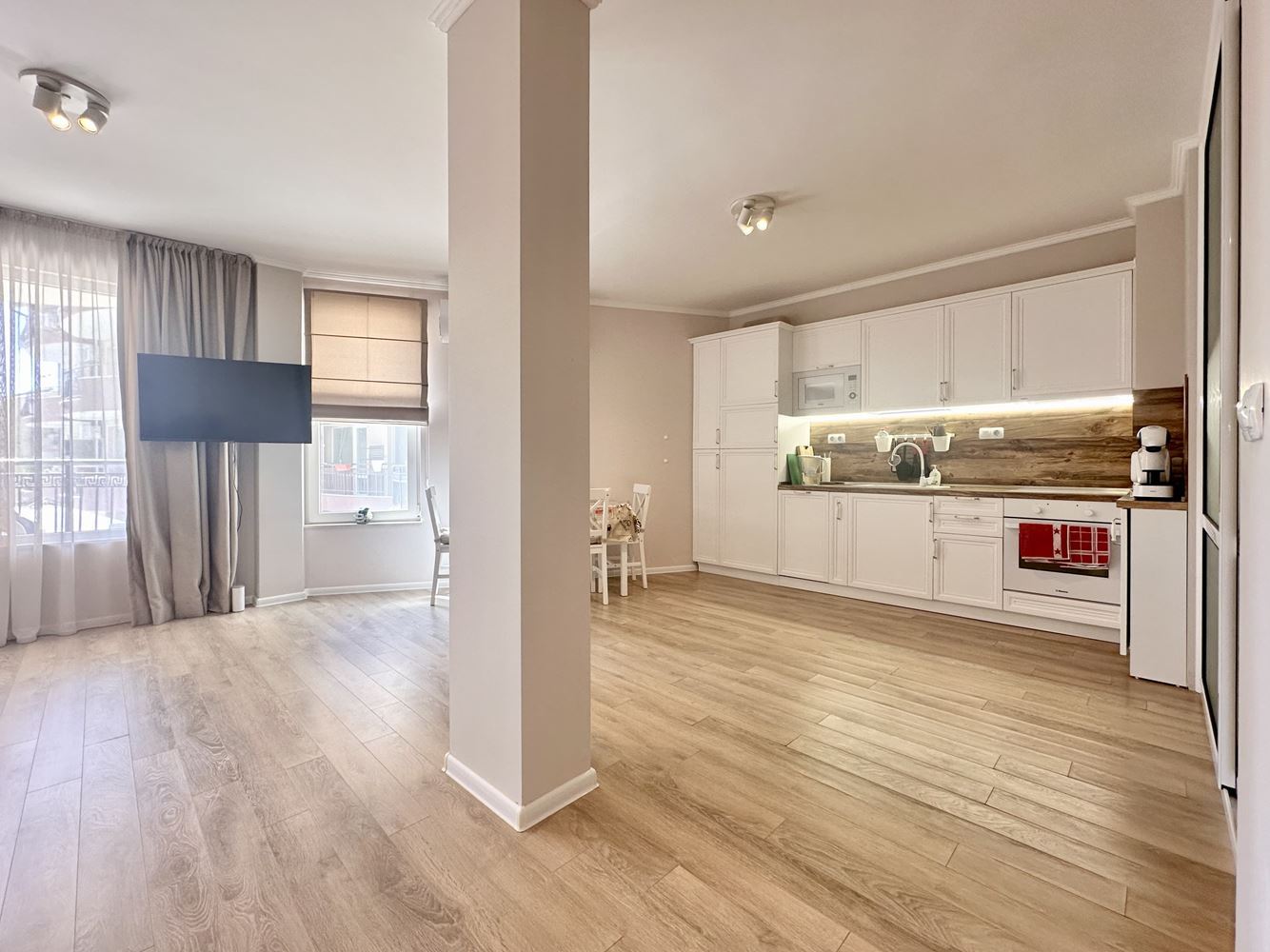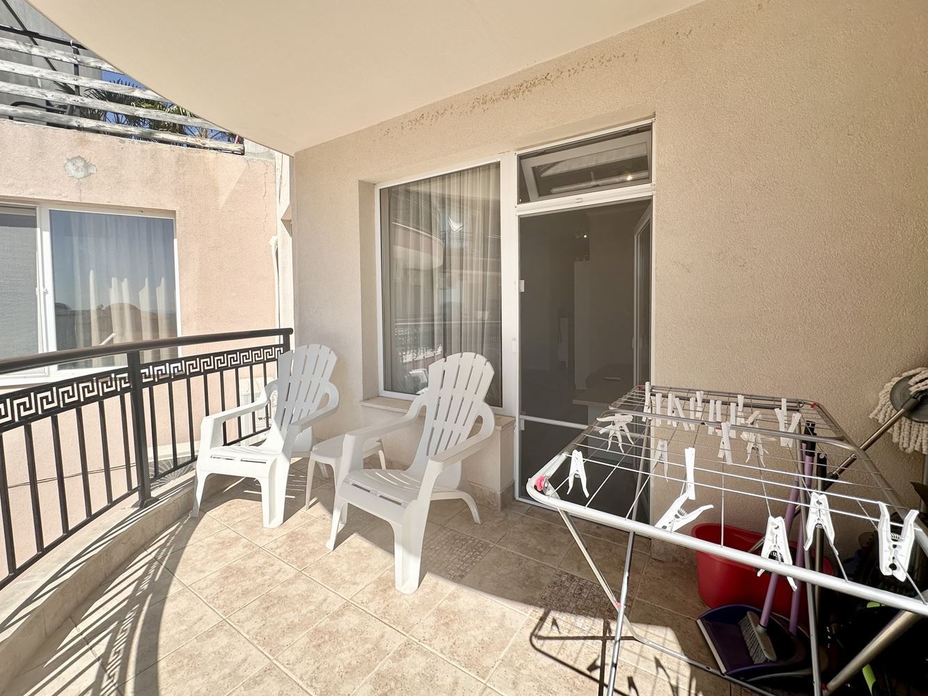 Жилището впечатлява със своята просторност и функционално разпределение, създаващо усещане за свобода и светлина. Големите прозорци разкриват красива гледка към басейна и морето, която превръща всеки ден в удоволствие. Това е място, където можете да се насладите на сутрешното си кафе с морски хоризонт или да релаксирате вечер в спокойна и уютна атмосфера.