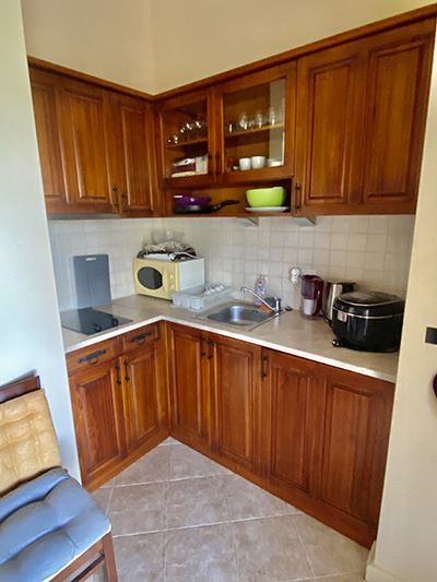 На първо ниво е разположена светла и просторна дневна с кухня, от която се излиза на голяма тераса с впечатляваща панорамна гледка към морето и планината. Това пространство е идеално за отдих, сутрешно кафе или вечерни моменти на спокойствие сред природата.
