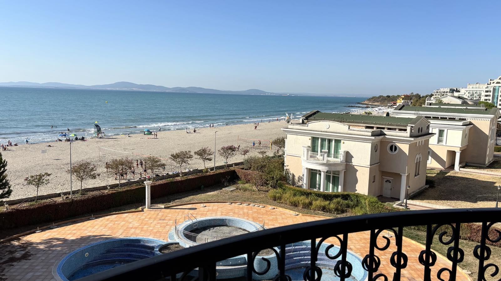 Локацията на имота е сред най-желаните в Поморие, комбинирайки удобство, близост до плажа и престижна среда. Комплексът предлага богата инфраструктура за отдих и забавление, включително няколко външни басейна, детски водни пързалки, два бара, кафене и ресторанти, както и СПА център за пълноценен релакс. Контролиран достъп и целогодишна поддръжка гарантират сигурност и спокойствие за собствениците.