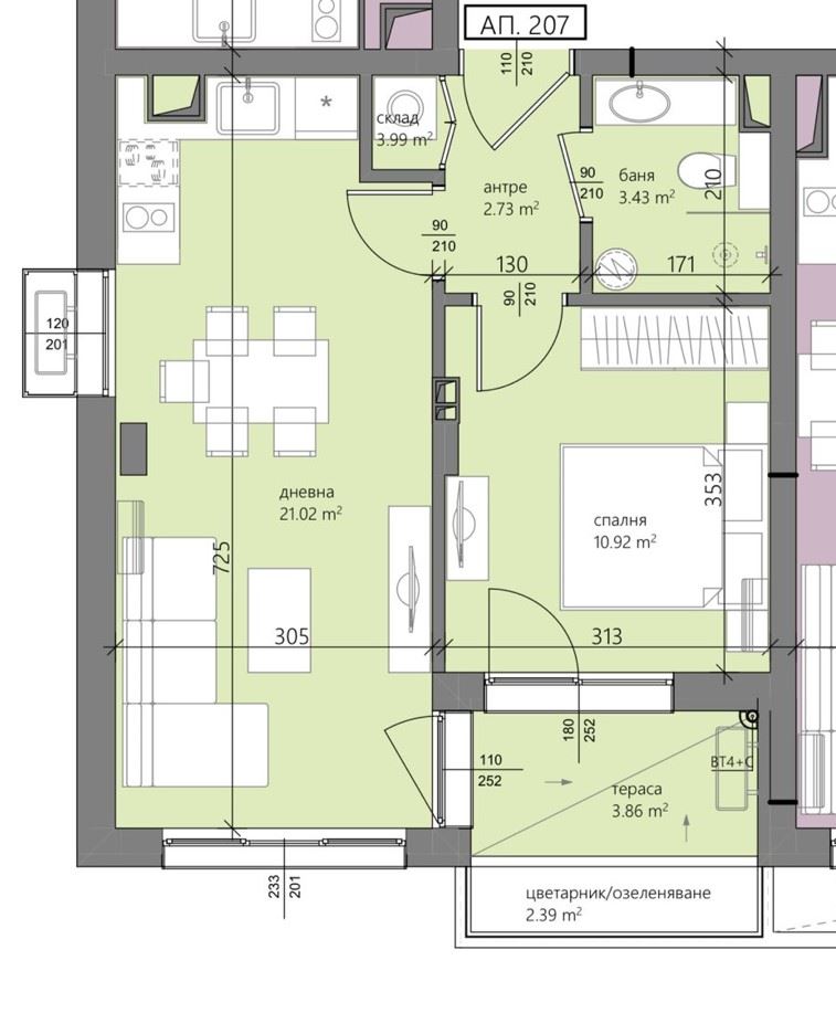 Жилището впечатлява с добре обмислено разпределение – дневна с кухненски бокс, уютна спалня, баня и балкон, който предлага приятно пространство за отдих и свеж въздух. Светлите и просторни помещения създават усещане за простор и комфорт, като интериорът е изпълнен със съвременни материали и елегантни детайли, които придават завършен и стилен вид.